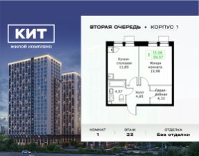 Продаётся 1-к квартира 39.37 кв.м. без отделки в ЖК ''КИТ2'' на 23-м этаже 25 этажного дома.Жилой комплекс ''Кит 2'' спроектирован в урбанистической концепции ''Город в Городе''. Объект бизнес-класса предлагает рациональный подход к набору опций, необходимых для гармоничной жизни. Проект представляет собой два корпуса, которые образуют единую приватную территорию. Ее доминантой является двор с красивым ландшафтным дизайном и различными зонами, ориентированными на интересы жителей разного возраста.При создании пространства в приоритет ставился комфорт жителей. В шаговой доступности находятся: торговый центр, рестораны, кинотеатры, спортивный зал, образовательные учреждения и множество других объектов в сфере услуг. Преимущества проекта: - 3 корпуса для приватной жизни - Видовые характеристики (просматриваются Москва - Сити и Останкинская телебашня) - Широкая квартирография по всем типам квартир- Увеличенное остекление - 3 варианта отделки: БОРДО, СТОКГОЛЬМ, ОСЛО - Богатая развлекательная инфраструктура - Высокий уровень безопасности территории Расположение комплекса: - 2,2 км до Волковского шоссе - 2,8 км до Ярославского шоссе - 5,7 км до МКАД - 5 минут пешком до ж/д станции ''Мытищи'' и Автовокзала - 18 минут до станции метро ''Комсомольская'' - 30 минут до станции метро ''Медведково''