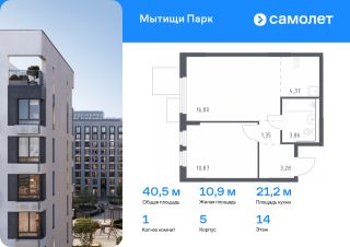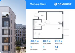 Предлагается 1-комнатная квартира комфорт-класса 38,63 кв.м в корпусе 5 на 14 этаже, в ЖК ''Мытищи Парк''Квартира с чистовой отделкой. Доступность дополнительных опций уточняйте у застройщика.Планировкой предусмотрены:Прихожая - 4,64 м²Кухня-ниша - 4,32 м²Жилая_комната_1 - 14,97 м²Жилая_комната_2 - 10,46 м²СУ_1 - 3,86 м²Балкон - 0,38 м²Приобрести квартиру возможно по специальным акциям от застройщика, с текущими условиями акций можно ознакомиться в блоке Акций.Цена динамическая и может отличаться, уточняйте актуальность у застройщика.ЖК ''Мытищи Парк'' — это надежные и долговечные монолитные корпуса. При проектировании домов и территории застройщик учел потребности жильцов всех возрастов — молодых пар, семей с детьми и пожилых людей.ЖК ''Мытищи Парк'' расположен в Московской области и с двух сторон окружен Пироговским лесопарком.