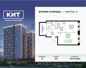 Продаётся 2-к квартира 48.35 кв.м. с чистовой отделкой в ЖК ''КИТ2'' на 22-м этаже 25 этажного дома.Жилой комплекс ''Кит 2'' спроектирован в урбанистической концепции ''Город в Городе''. Объект бизнес-класса предлагает рациональный подход к набору опций, необходимых для гармоничной жизни. Проект представляет собой два корпуса, которые образуют единую приватную территорию. Ее доминантой является двор с красивым ландшафтным дизайном и различными зонами, ориентированными на интересы жителей разного возраста.При создании пространства в приоритет ставился комфорт жителей. В шаговой доступности находятся: торговый центр, рестораны, кинотеатры, спортивный зал, образовательные учреждения и множество других объектов в сфере услуг. Преимущества проекта: - 3 корпуса для приватной жизни - Видовые характеристики (просматриваются Москва - Сити и Останкинская телебашня) - Широкая квартирография по всем типам квартир- Увеличенное остекление - 3 варианта отделки: БОРДО, СТОКГОЛЬМ, ОСЛО - Богатая развлекательная инфраструктура - Высокий уровень безопасности территории Расположение комплекса: - 2,2 км до Волковского шоссе - 2,8 км до Ярославского шоссе - 5,7 км до МКАД - 5 минут пешком до ж/д станции ''Мытищи'' и Автовокзала - 18 минут до станции метро ''Комсомольская'' - 30 минут до станции метро ''Медведково''