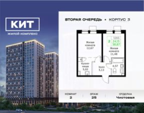 Продаётся 2-к квартира 38.87 кв.м. с чистовой отделкой в ЖК ''КИТ2'' на 25-м этаже 25 этажного дома.Жилой комплекс ''Кит 2'' спроектирован в урбанистической концепции ''Город в Городе''. Объект бизнес-класса предлагает рациональный подход к набору опций, необходимых для гармоничной жизни. Проект представляет собой два корпуса, которые образуют единую приватную территорию. Ее доминантой является двор с красивым ландшафтным дизайном и различными зонами, ориентированными на интересы жителей разного возраста.При создании пространства в приоритет ставился комфорт жителей. В шаговой доступности находятся: торговый центр, рестораны, кинотеатры, спортивный зал, образовательные учреждения и множество других объектов в сфере услуг. Преимущества проекта: - 3 корпуса для приватной жизни - Видовые характеристики (просматриваются Москва - Сити и Останкинская телебашня) - Широкая квартирография по всем типам квартир- Увеличенное остекление - 3 варианта отделки: БОРДО, СТОКГОЛЬМ, ОСЛО - Богатая развлекательная инфраструктура - Высокий уровень безопасности территории Расположение комплекса: - 2,2 км до Волковского шоссе - 2,8 км до Ярославского шоссе - 5,7 км до МКАД - 5 минут пешком до ж/д станции ''Мытищи'' и Автовокзала - 18 минут до станции метро ''Комсомольская'' - 30 минут до станции метро ''Медведково''