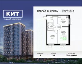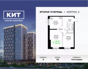 Продаётся 2-к квартира 56.45 кв.м. с чистовой отделкой в ЖК ''КИТ2'' на 18-м этаже 25 этажного дома.Жилой комплекс ''Кит 2'' спроектирован в урбанистической концепции ''Город в Городе''. Объект бизнес-класса предлагает рациональный подход к набору опций, необходимых для гармоничной жизни. Проект представляет собой два корпуса, которые образуют единую приватную территорию. Ее доминантой является двор с красивым ландшафтным дизайном и различными зонами, ориентированными на интересы жителей разного возраста.При создании пространства в приоритет ставился комфорт жителей. В шаговой доступности находятся: торговый центр, рестораны, кинотеатры, спортивный зал, образовательные учреждения и множество других объектов в сфере услуг. Преимущества проекта: - 3 корпуса для приватной жизни - Видовые характеристики (просматриваются Москва - Сити и Останкинская телебашня) - Широкая квартирография по всем типам квартир- Увеличенное остекление - 3 варианта отделки: БОРДО, СТОКГОЛЬМ, ОСЛО - Богатая развлекательная инфраструктура - Высокий уровень безопасности территории Расположение комплекса: - 2,2 км до Волковского шоссе - 2,8 км до Ярославского шоссе - 5,7 км до МКАД - 5 минут пешком до ж/д станции ''Мытищи'' и Автовокзала - 18 минут до станции метро ''Комсомольская'' - 30 минут до станции метро ''Медведково''