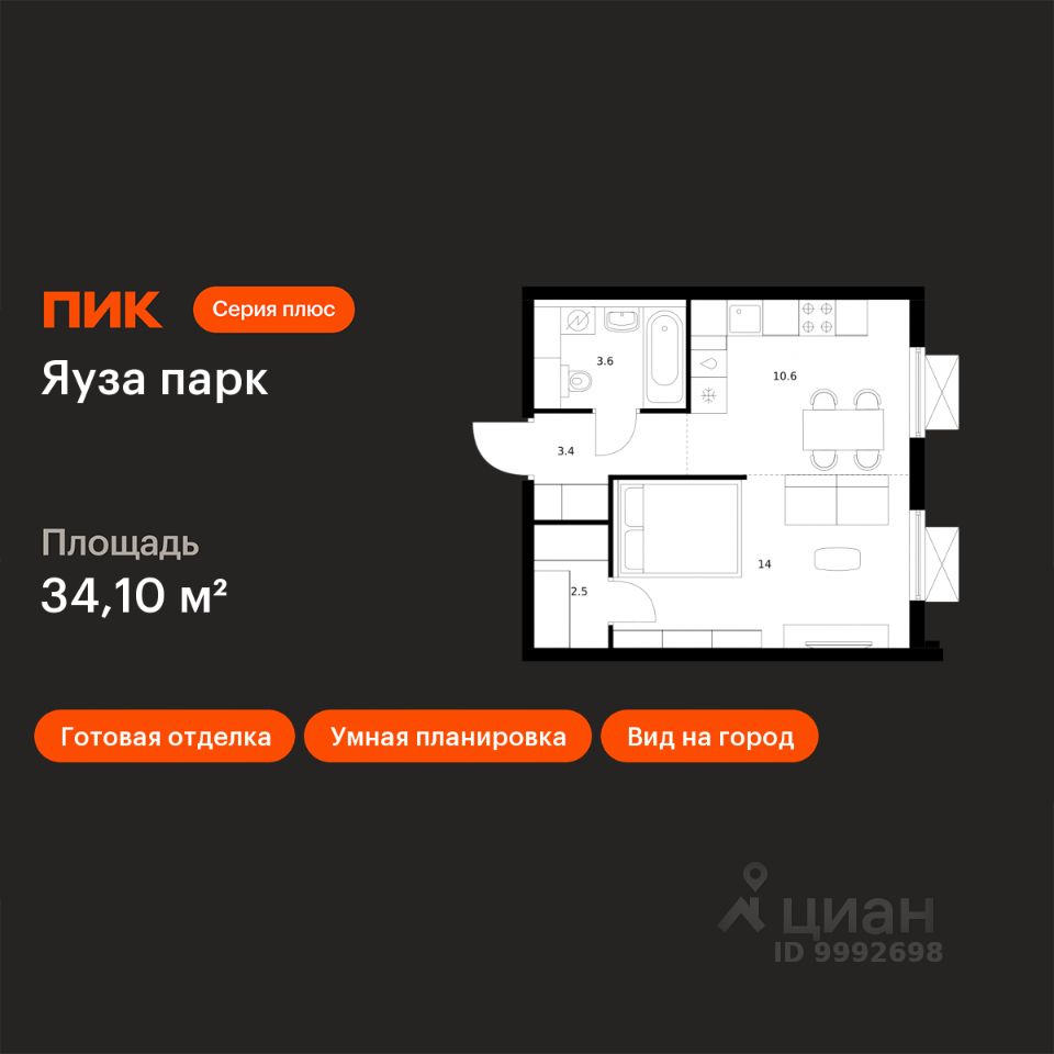 Продаётся 1-комн. квартира площадью 34,1 кв.м на 14 этаже 24 этажного дома (Корпус 6, Секция 1) проекта ПИК Яуза парк. Светлый просторный подъезд на уровне земли, функциональная планировка, большие окна, c отделкой. Жилой квартал ''Яуза парк'' возводится в Мытищах, в 5 минутах ходьбы от одноимённой ж/д станции. Проект включает 20 домов разной этажности с благоустроенными дворами-парками. Сейчас в квартале началось строительство новых корпусов 7-12. Это отличная возможность купить квартиру по стартовой цене. Индивидуальный дизайн фасадов разработали архитектурные бюро KATARSIS и RHIZOME. Вблизи жилого квартала появятся шумопоглощающие экраны, позволяющие забыть о том, что неподалёку находятся железнодорожные пути. На первых этажах домов откроются магазины, кафе, салоны красоты и другие полезные сервисы. Рядом есть школы и детские сады, магазины и ТРЦ ''Красный кит''. На территории проекта появится благоустроенная набережная реки Яузы и пешеходный бульвар для прогулок всей семьёй. Водонапорную башню XIX века, расположенную на территории ''Яуза парка'', мы реставрируем и создадим вокруг неё общественное пространство для отдыха жителей квартала. Для прогулок отлично подойдёт Мытищинский центральный парк культуры и отдыха, расположенный в 10 минутах ходьбы, и Лосиный остров — в 24 минутах. Дорога на автомобиле до Ярославского шоссе займёт не более 3 минут, до МКАД — 10 минут. Артикул 940852 (Застройщик ООО ''Специализированный ''НМ-Консалт'')