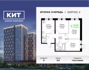 Продаётся 3-к квартира 72.04 кв.м. с чистовой отделкой в ЖК ''КИТ2'' на 23-м этаже 25 этажного дома.Жилой комплекс ''Кит 2'' спроектирован в урбанистической концепции ''Город в Городе''. Объект бизнес-класса предлагает рациональный подход к набору опций, необходимых для гармоничной жизни. Проект представляет собой два корпуса, которые образуют единую приватную территорию. Ее доминантой является двор с красивым ландшафтным дизайном и различными зонами, ориентированными на интересы жителей разного возраста.При создании пространства в приоритет ставился комфорт жителей. В шаговой доступности находятся: торговый центр, рестораны, кинотеатры, спортивный зал, образовательные учреждения и множество других объектов в сфере услуг. Преимущества проекта: - 3 корпуса для приватной жизни - Видовые характеристики (просматриваются Москва - Сити и Останкинская телебашня) - Широкая квартирография по всем типам квартир- Увеличенное остекление - 3 варианта отделки: БОРДО, СТОКГОЛЬМ, ОСЛО - Богатая развлекательная инфраструктура - Высокий уровень безопасности территории Расположение комплекса: - 2,2 км до Волковского шоссе - 2,8 км до Ярославского шоссе - 5,7 км до МКАД - 5 минут пешком до ж/д станции ''Мытищи'' и Автовокзала - 18 минут до станции метро ''Комсомольская'' - 30 минут до станции метро ''Медведково''