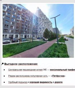 - *Ключевые преимущества для бизнеса* - *Целевая аудитория:* Жители масштабного ЖК (1766 квартир только в 3-м квартале) . - *Платежеспособность:* Средняя стоимость квартир в ЖК — *5.318 млн ?*, что указывает на высокий доход жильцов . *Рекомендуемые форматы коммерции* - *Фуд-ритейл:* Кофейни, пекарни (спрос со стороны жителей и гостей комплекса). - *Услуги:* Аптека, химчистка, ремонт техники (нехватка подобных сервисов в новостройках). - *Детские центры:* Развивающие секции, кружки (актуально при 3 детсадах и 2 школах). *Примечание:* Сроки сдачи последних очередей ЖК — до *III квартала 2025 г.* , что означает постепенный рост потока клиентов. Для помещений в уже сданных корпусах (кварталы 13) можно начинать бизнес сразу. Также мы обеспечим Вам стабильный доход без личного участия!Если Вы живете в другой стране/городе, если хотите тратить время на то, что любите, а не ведение дел, связанных с управлением имуществом, если нуждаетесь в профессиональной поддержке и опыте специалистов, стремитесь получать пассивный доход , то с нашей услугой Управления Жилой и Коммерческой недвижимости мы берем на себя все процессы.В течение действия договора, мы подбираем арендатора под Ваш запрос на выгодных условиях, также полностью берем контроль над состоянием объекта.Ведем учёт показаний счётчиков, получения оплаты, соблюдения графика арендных платежей, бухгалтерский учет, решаем юридические/бытовые вопросы и т.п.Будем рады рассказать подробнее!