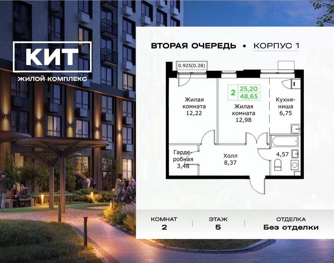 Продаётся 2-к квартира 48.65 кв.м. без отделки в ЖК ''КИТ2'' на 5-м этаже 25 этажного дома.Жилой комплекс ''Кит 2'' спроектирован в урбанистической концепции ''Город в Городе''. Объект бизнес-класса предлагает рациональный подход к набору опций, необходимых для гармоничной жизни. Проект представляет собой два корпуса, которые образуют единую приватную территорию. Ее доминантой является двор с красивым ландшафтным дизайном и различными зонами, ориентированными на интересы жителей разного возраста. При создании пространства в приоритет ставился комфорт жителей. В шаговой доступности находятся: торговый центр, рестораны, кинотеатры, спортивный зал, образовательные учреждения и множество других объектов в сфере услуг. Преимущества проекта: - 3 корпуса для приватной жизни - Видовые характеристики (просматриваются Москва - Сити и Останкинская телебашня) - Широкая квартирография по всем типам квартир - Увеличенное остекление - 3 варианта отделки: БОРДО, СТОКГОЛЬМ, ОСЛО - Богатая развлекательная инфраструктура - Высокий уровень безопасности территории Расположение комплекса: - 2,2 км до Волковского шоссе - 2,8 км до Ярославского шоссе - 5,7 км до МКАД - 5 минут пешком до ж/д станции ''Мытищи'' и Автовокзала - 18 минут до станции метро ''Комсомольская'' - 30 минут до станции метро ''Медведково''