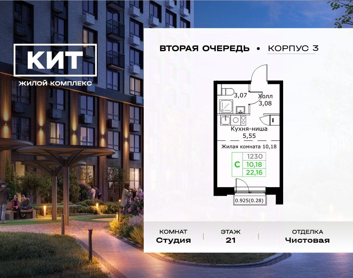 Продаётся студия 22.16 кв.м. с чистовой отделкой в ЖК ''КИТ2'' на 21-м этаже 25 этажного дома.Жилой комплекс ''Кит 2'' спроектирован в урбанистической концепции ''Город в Городе''. Объект бизнес-класса предлагает рациональный подход к набору опций, необходимых для гармоничной жизни. Проект представляет собой два корпуса, которые образуют единую приватную территорию. Ее доминантой является двор с красивым ландшафтным дизайном и различными зонами, ориентированными на интересы жителей разного возраста. При создании пространства в приоритет ставился комфорт жителей. В шаговой доступности находятся: торговый центр, рестораны, кинотеатры, спортивный зал, образовательные учреждения и множество других объектов в сфере услуг. Преимущества проекта: - 3 корпуса для приватной жизни - Видовые характеристики (просматриваются Москва - Сити и Останкинская телебашня) - Широкая квартирография по всем типам квартир - Увеличенное остекление - 3 варианта отделки: БОРДО, СТОКГОЛЬМ, ОСЛО - Богатая развлекательная инфраструктура - Высокий уровень безопасности территории Расположение комплекса: - 2,2 км до Волковского шоссе - 2,8 км до Ярославского шоссе - 5,7 км до МКАД - 5 минут пешком до ж/д станции ''Мытищи'' и Автовокзала - 18 минут до станции метро ''Комсомольская'' - 30 минут до станции метро ''Медведково''