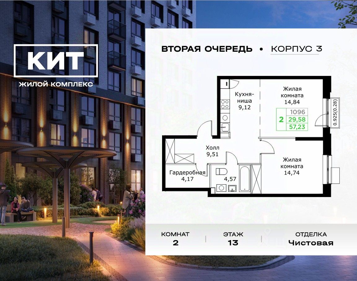 Продаётся 2-к квартира 57.23 кв.м. с чистовой отделкой в ЖК ''КИТ2'' на 13-м этаже 25 этажного дома.Жилой комплекс ''Кит 2'' спроектирован в урбанистической концепции ''Город в Городе''. Объект бизнес-класса предлагает рациональный подход к набору опций, необходимых для гармоничной жизни. Проект представляет собой два корпуса, которые образуют единую приватную территорию. Ее доминантой является двор с красивым ландшафтным дизайном и различными зонами, ориентированными на интересы жителей разного возраста. При создании пространства в приоритет ставился комфорт жителей. В шаговой доступности находятся: торговый центр, рестораны, кинотеатры, спортивный зал, образовательные учреждения и множество других объектов в сфере услуг. Преимущества проекта: - 3 корпуса для приватной жизни - Видовые характеристики (просматриваются Москва - Сити и Останкинская телебашня) - Широкая квартирография по всем типам квартир - Увеличенное остекление - 3 варианта отделки: БОРДО, СТОКГОЛЬМ, ОСЛО - Богатая развлекательная инфраструктура - Высокий уровень безопасности территории Расположение комплекса: - 2,2 км до Волковского шоссе - 2,8 км до Ярославского шоссе - 5,7 км до МКАД - 5 минут пешком до ж/д станции ''Мытищи'' и Автовокзала - 18 минут до станции метро ''Комсомольская'' - 30 минут до станции метро ''Медведково''