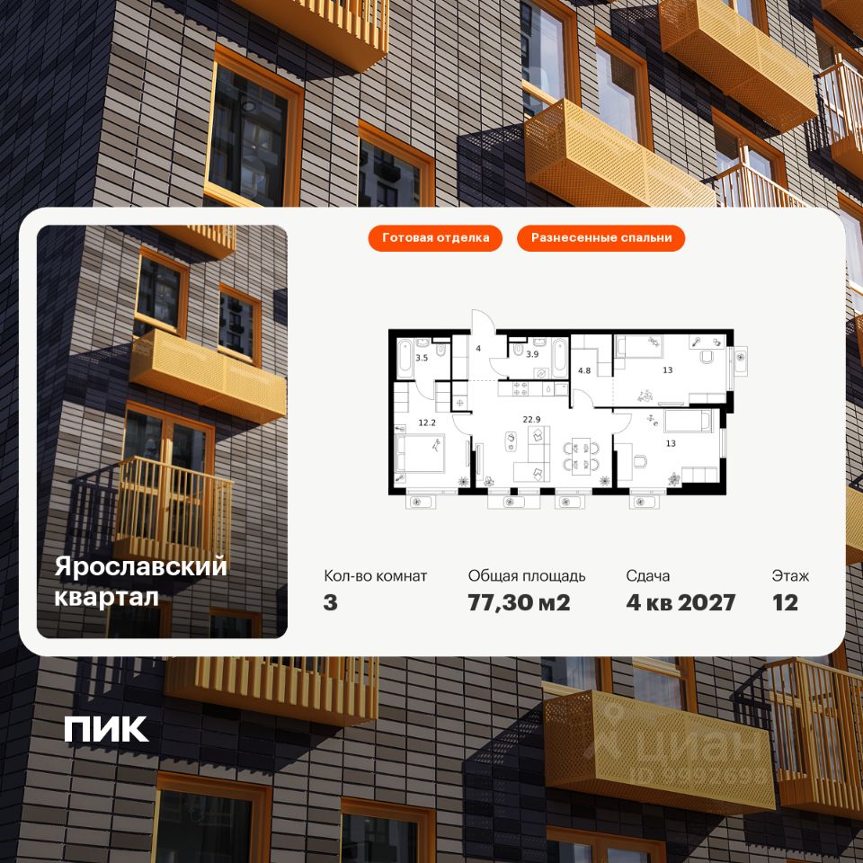 Продаётся 2-комн. квартира площадью 51,4 кв.м на 12 этаже 25 этажного дома (Корпус 2.2, Секция 1) проекта ПИК Ярославский квартал. Светлый просторный подъезд на уровне земли, функциональная планировка, большие окна, c отделкой. Проект ''Ярославский квартал'' возводится в Мытищах, в 6 км от МКАД. Жилой квартал, состоящий из 8 корпусов, строится рядом с Ярославским шоссе и имеет удобный заезд с крупной автомагистрали. На территории проекта появится школа, детский сад и пешеходный бульвар. Индивидуальные дизайны фасадов для ''Ярославского квартала'' разработало петербургское архитектурное бюро RHIZOME. В их портфолио вошли работы для Московского музея современного искусства, ГЦСИ, Манифеста 10 и ЦВЗ Манеж. За 7 минут можно дойти пешком до ближайшей автобусной остановки. Столько же займёт дорога до ''Лосиного острова'' - облагороженного парка с разными активностями для всей семьи, благоустроенными зонами для отдыха, местами для прогулок и пробежек на свежем воздухе. Доехать на автомобиле до Ярославского шоссе получится за 3 минуты, до станции ''Мытищи'' - за 9 минут, до МКАД - за 15 минут. Артикул 1013169 (Застройщик ООО ''Специализированный ''ГЕОПАРК'')