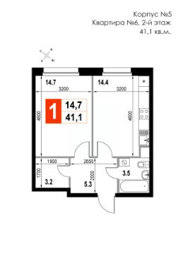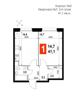 Продаётся 1-комнатная квартира в строящемся доме (Корпус 5), срок сдачи: II-кв. 2026, общей площадью 41.1 кв.м., на 2 этаже. Многоквартирный жилой дом со встроенно-пристроенными нежилыми помещениями и автостоянкой