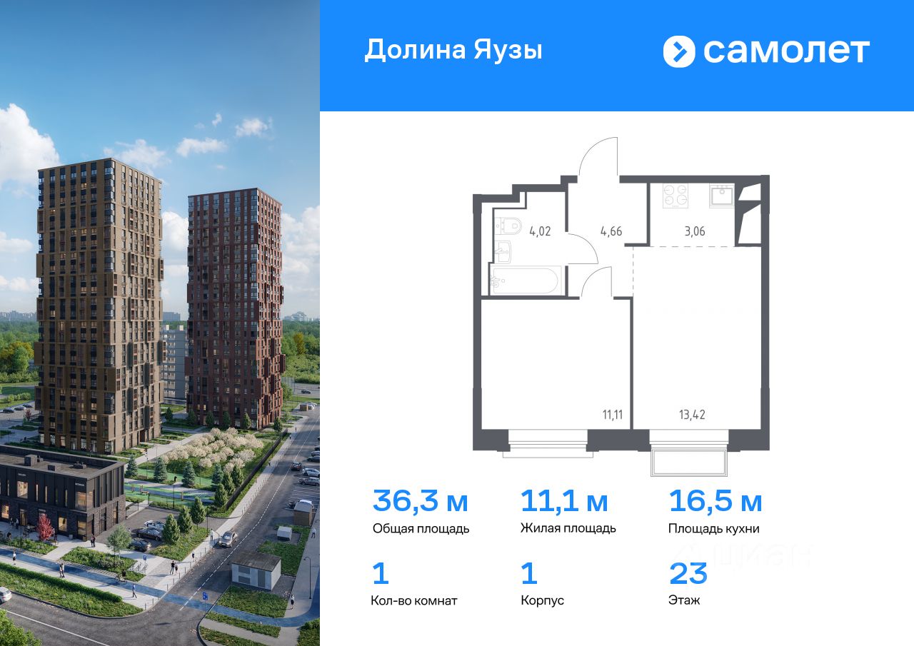 Строим кварталы для жизни с заботой о будущем. Предлагается 1-комнатная квартира комфорт-класса 36,27 кв.м в корпусе 1 на 23 этаже, в ЖК ''Долина Яузы'' Квартира с чистовой отделкой. Доступность дополнительных опций уточняйте у застройщика. Приобрести квартиру возможно по специальным акциям от застройщика, с текущими условиями акций можно ознакомиться в блоке ''Акций''. Цена динамическая и может отличаться, уточняйте актуальность у застройщика. Жилой комплекс комфорт-класса ''Долина Яузы'' расположен на северо-востоке Московской области, в 200 м от МКАД. До ж/д станции Перловская или набережной реки Яуза можно дойти за 10 минут. В шаговой доступности находятся детские сады, школы, стоматология и поликлиника. Есть супермаркеты и кофейни, детские и спортивные площадки, зоны отдыха под навесом. У каждого дома будет собственный двор-сад, где посадят плодовые и вечнозеленые деревья и кустарники. Территория около жилого комплекса закрыта от машин и посторонних и круглосуточно охраняется. В жилом комплексе ''Долина Яузы'' большой выбор квартир: от однокомнатных до трехкомнатных. Квартиры сдаются с готовой отделкой или без нее.