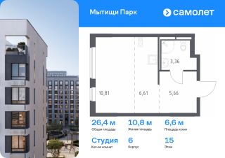 Предлагается квартира студия комфорт-класса 26,44 кв.м в корпусе 6 на 15 этаже, в ЖК ''Мытищи Парк''Квартира без отделки. Доступность опции ''отделка'' и возможность комплектации мебелью и декором уточняйте у застройщика.Планировкой предусмотрены:Прихожая - 5,68 м²Кухня-ниша - 6,61 м²Студия - 10,81 м²СУ_1 - 3,34 м²Приобрести квартиру возможно по специальным акциям от застройщика, с текущими условиями акций можно ознакомиться в блоке Акций.Цена динамическая и может отличаться, уточняйте актуальность у застройщика.ЖК ''Мытищи Парк'' — это надежные и долговечные монолитные корпуса. При проектировании домов и территории застройщик учел потребности жильцов всех возрастов — молодых пар, семей с детьми и пожилых людей.ЖК ''Мытищи Парк'' расположен в Московской области и с двух сторон окружен Пироговским лесопарком.