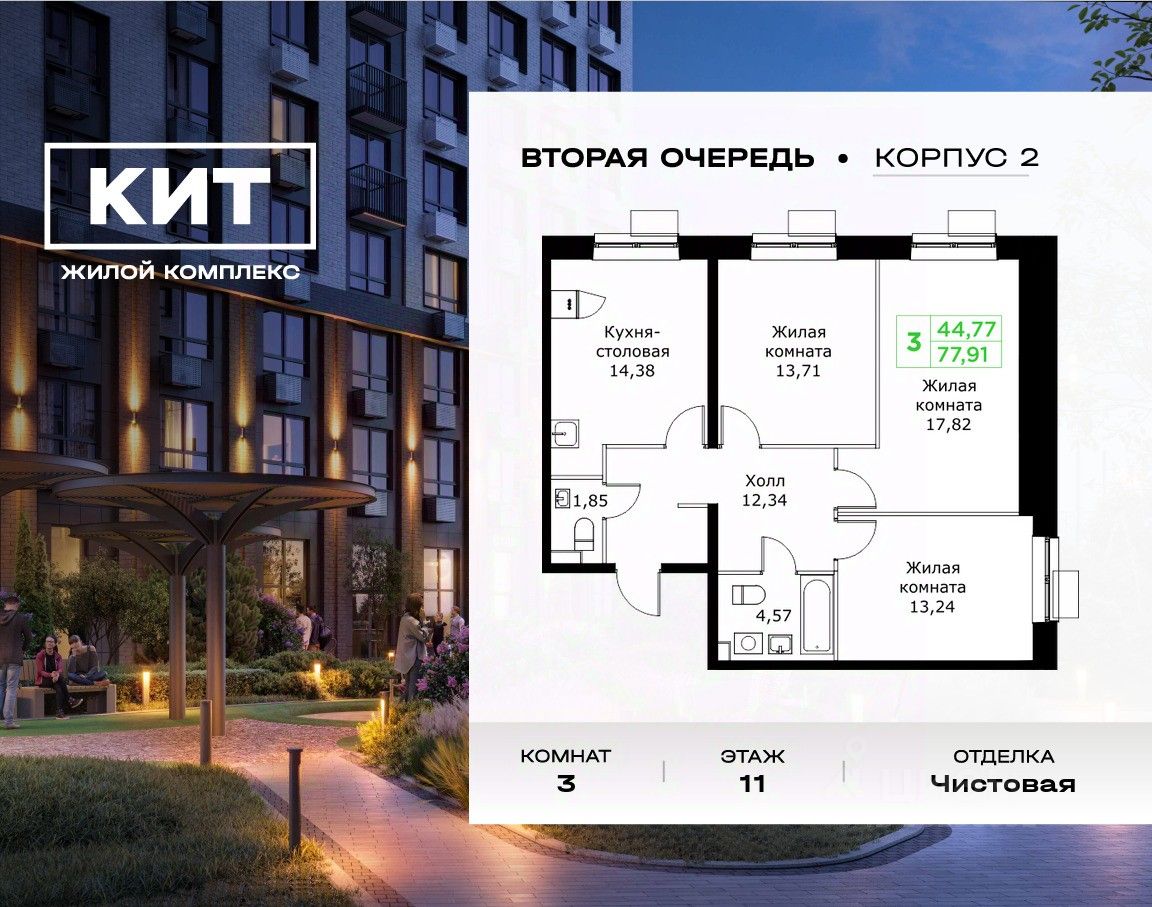 Продаётся 3-комнатная квартира в строящемся доме (Корпус 1.1), срок сдачи: III-кв. 2025, общей площадью 84.9 кв.м., на 15 этаже.