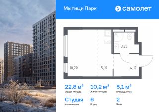 Строим кварталы для жизни с заботой о будущем. Предлагается квартира студия комфорт-класса 22,82 кв.м в корпусе 6 на 10 этаже, в ЖК ''Мытищи Парк''Квартира без отделки. Доступность опции ''отделка'' и возможность комплектации мебелью и декором уточняйте у застройщика.Приобрести квартиру возможно по специальным акциям от застройщика, с текущими условиями акций можно ознакомиться в блоке ''Акций''.Цена динамическая и может отличаться, уточняйте актуальность у застройщика.ЖК ''Мытищи Парк'' — это надежные и долговечные монолитные корпуса. При проектировании домов и территории застройщик учел потребности жильцов всех возрастов — молодых пар, семей с детьми и пожилых людей.ЖК ''Мытищи Парк'' расположен в Московской области и с двух сторон окружен Пироговским лесопарком.