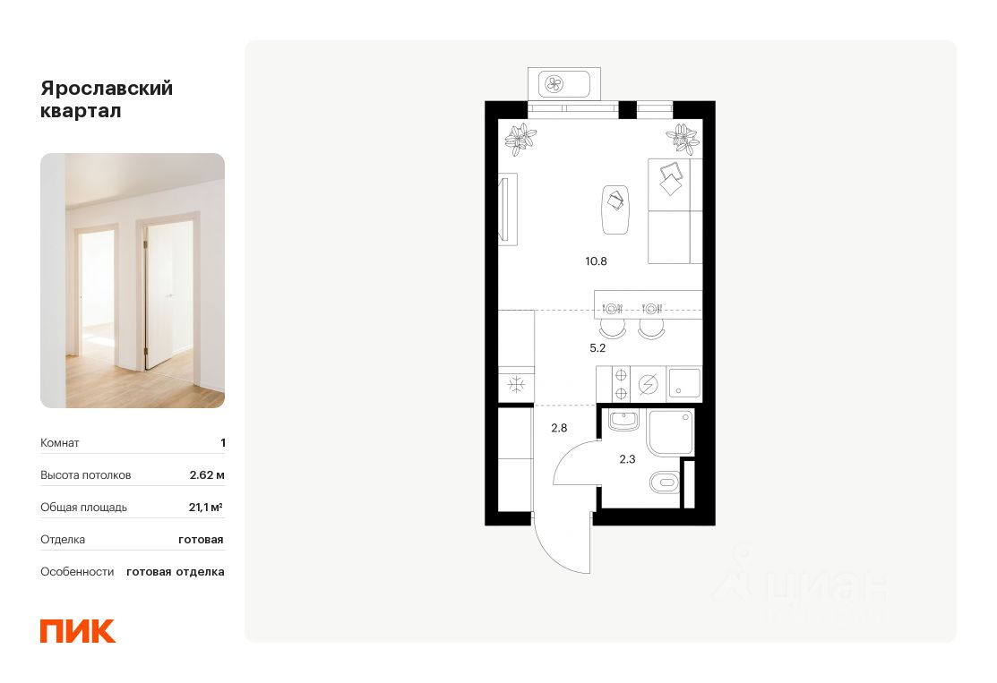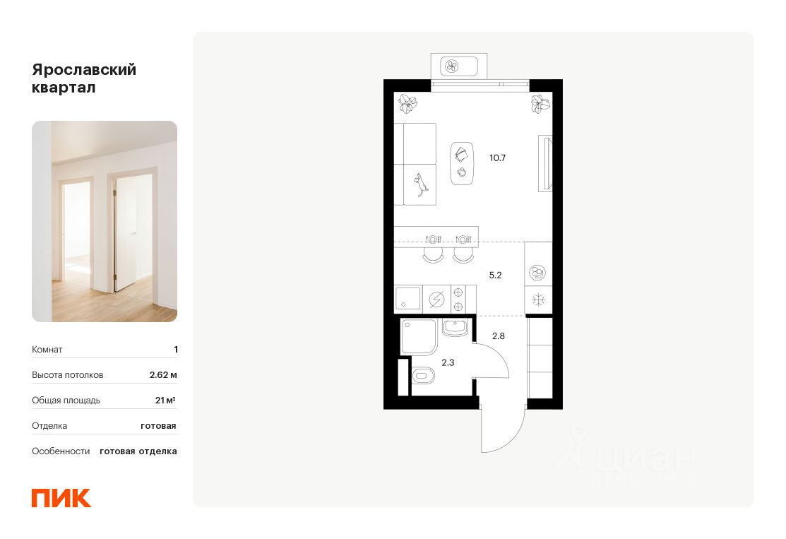 Продаётся квартира-студия площадью 21,1 кв.м на 18 этаже 25 этажного дома (Корпус 2.4, Секция 1) проекта ПИК Ярославский квартал. Светлый просторный подъезд на уровне земли, функциональная планировка, большие окна, c отделкой. Проект ''Ярославский квартал'' возводится в Мытищах, в 6 км от МКАД. Жилой квартал, состоящий из 8 корпусов, строится рядом с Ярославским шоссе и имеет удобный заезд с крупной автомагистрали. На территории проекта появится школа, детский сад и пешеходный бульвар. Индивидуальные дизайны фасадов для ''Ярославского квартала'' разработало петербургское архитектурное бюро RHIZOME. В их портфолио вошли работы для Московского музея современного искусства, ГЦСИ, Манифеста 10 и ЦВЗ Манеж. За 7 минут можно дойти пешком до ближайшей автобусной остановки. Столько же займёт дорога до ''Лосиного острова'' - облагороженного парка с разными активностями для всей семьи, благоустроенными зонами для отдыха, местами для прогулок и пробежек на свежем воздухе. Доехать на автомобиле до Ярославского шоссе получится за 3 минуты, до станции ''Мытищи'' - за 9 минут, до МКАД - за 15 минут. Артикул 1013563 (Застройщик ООО ''Специализированный ''ГЕОПАРК'')