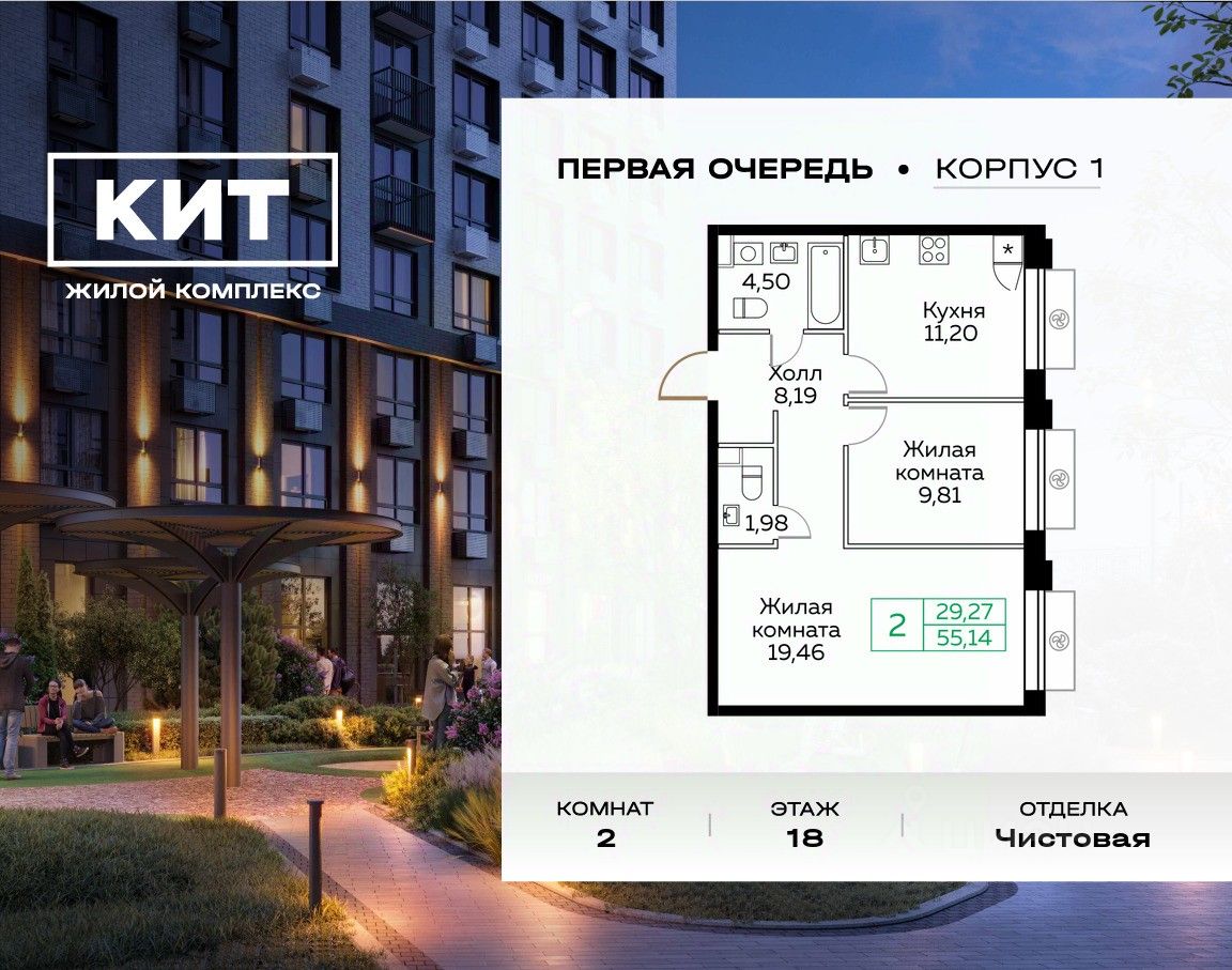 Дом сдан. Выдаем ключи! Продаётся 2-к квартира 55.2 кв.м. с чистовой отделкой в ЖК ''КИТ'' на 18-м этаже 25 этажного дома. Жилой комплекс ''Кит'' спроектирован в урбанистической концепции ''Город в Городе''. Объект бизнес-класса предлагает рациональный подход к набору опций, необходимых для гармоничной жизни. Проект представляет собой два корпуса, которые образуют единую приватную территорию. Ее доминантой является двор с красивым ландшафтным дизайном и различными зонами, ориентированными на интересы жителей разного возраста. При создании пространства в приоритет ставился комфорт жителей. В шаговой доступности находятся торговый центр, рестораны, кинотеатры, спортивный зал, образовательные учреждения и много других сфер услуг. Преимущества проекта: - Видовые характеристики (просматриваются Москва - Сити и Останкинская телебашня) - Широкая квартирография по всем типам квартир - Увеличенное остекление - 3 варианта отделки: без отделки, white box или чистовая отделка в скандинавском и итальянском стилях - Школа и детский сад рядом - Богатая развлекательная инфраструктура - Высокий уровень безопасности территории Расположение комплекса: - 5 минут пешком до ж/д ''Мытищи'' и автовокзала: - 19 минут до станции м. ''Комсомольская'' - 30 минут до станции м. ''Медведково'' - 2,2 км до Волковского шоссе - 2,8 км до Ярославского шоссе - 5,7 км до МКАД