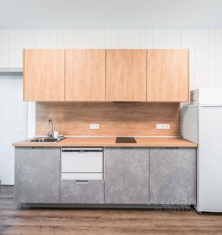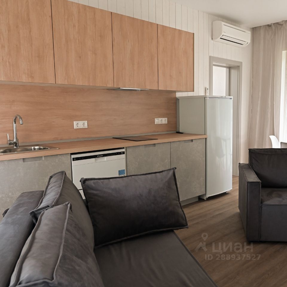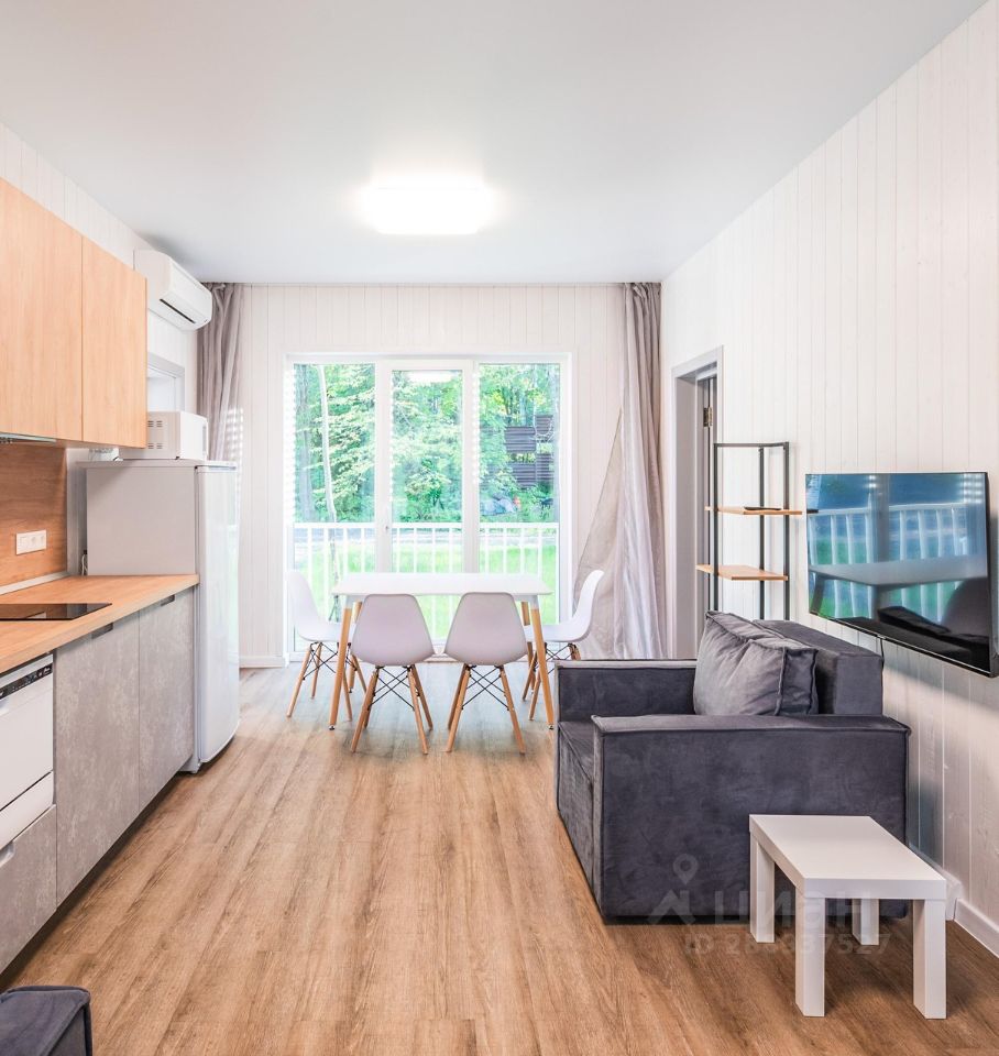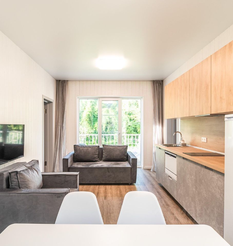 - Оборудованная кухня, гостинная со столом и диваном и видом на сад.