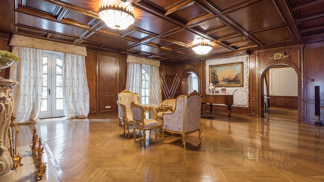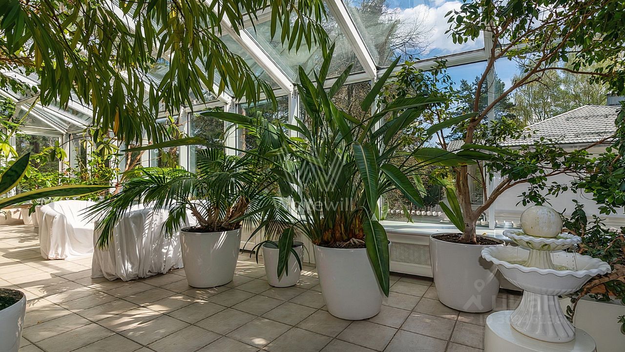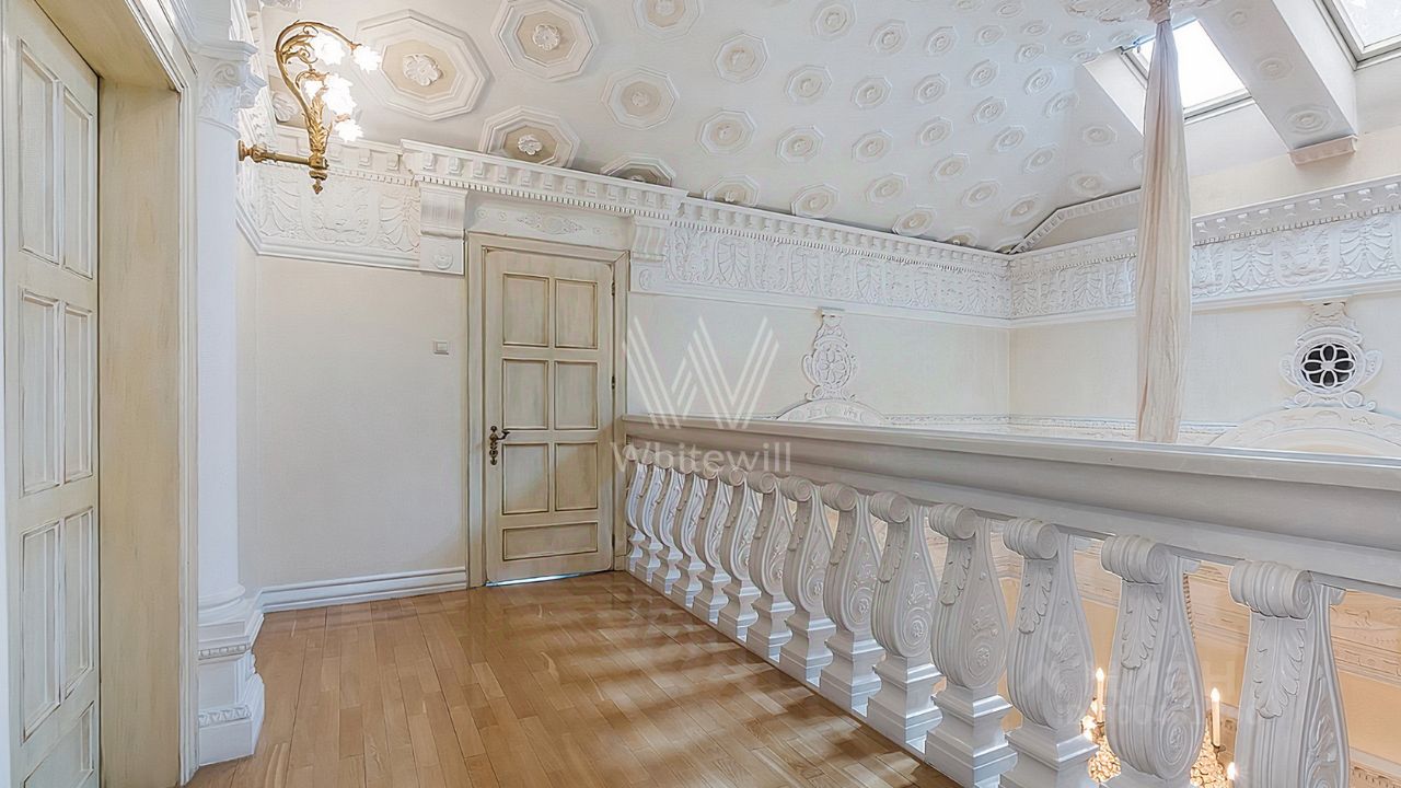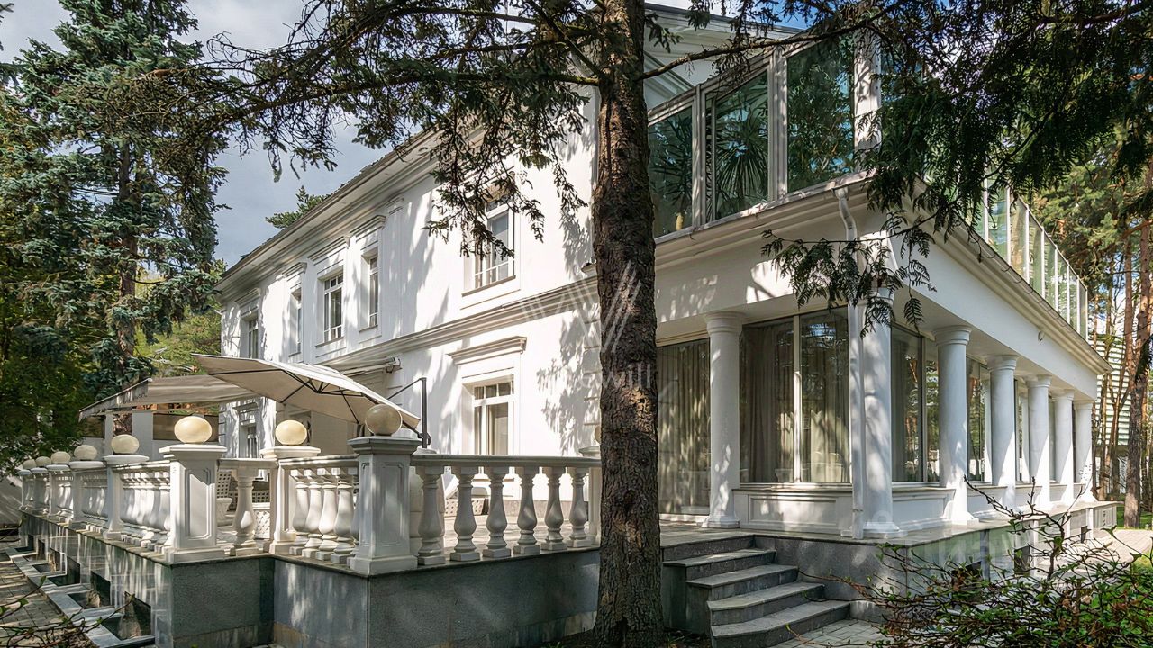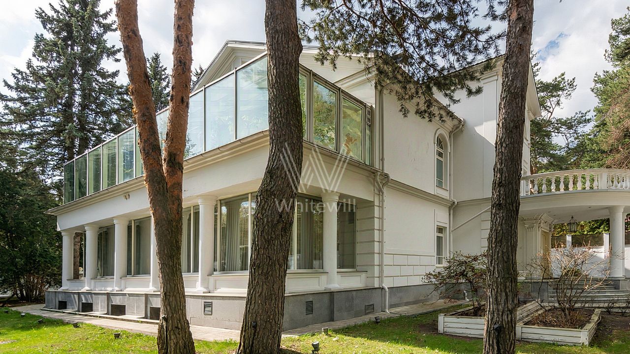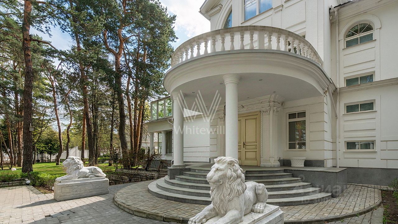 ID 12 268. Новь. Загородный особняк площадью 980 м² построен на просторном участке 53 сотки с многолетними деревьями. Молочный фасад здания выдержан в классическом стиле и декорирован колоннами, балясинами и резными элементами. В отделке интерьера преобладают теплые оттенки в сочетании с фактурой дерева. Планировка резиденции включает 6 спален, гостиную, кабинет-библиотеку, спортивный зал, зимнюю и летнюю веранду, кинотеатр и хаммам. Рядом расположены гостевой дом с 2-мя спальнями и гараж на 2 машины с квартирой для персонала на втором этаже. На участке выполнен ландшафтный дизайн, вымощены дорожки и установлено уличное освещение.