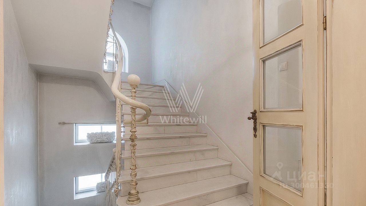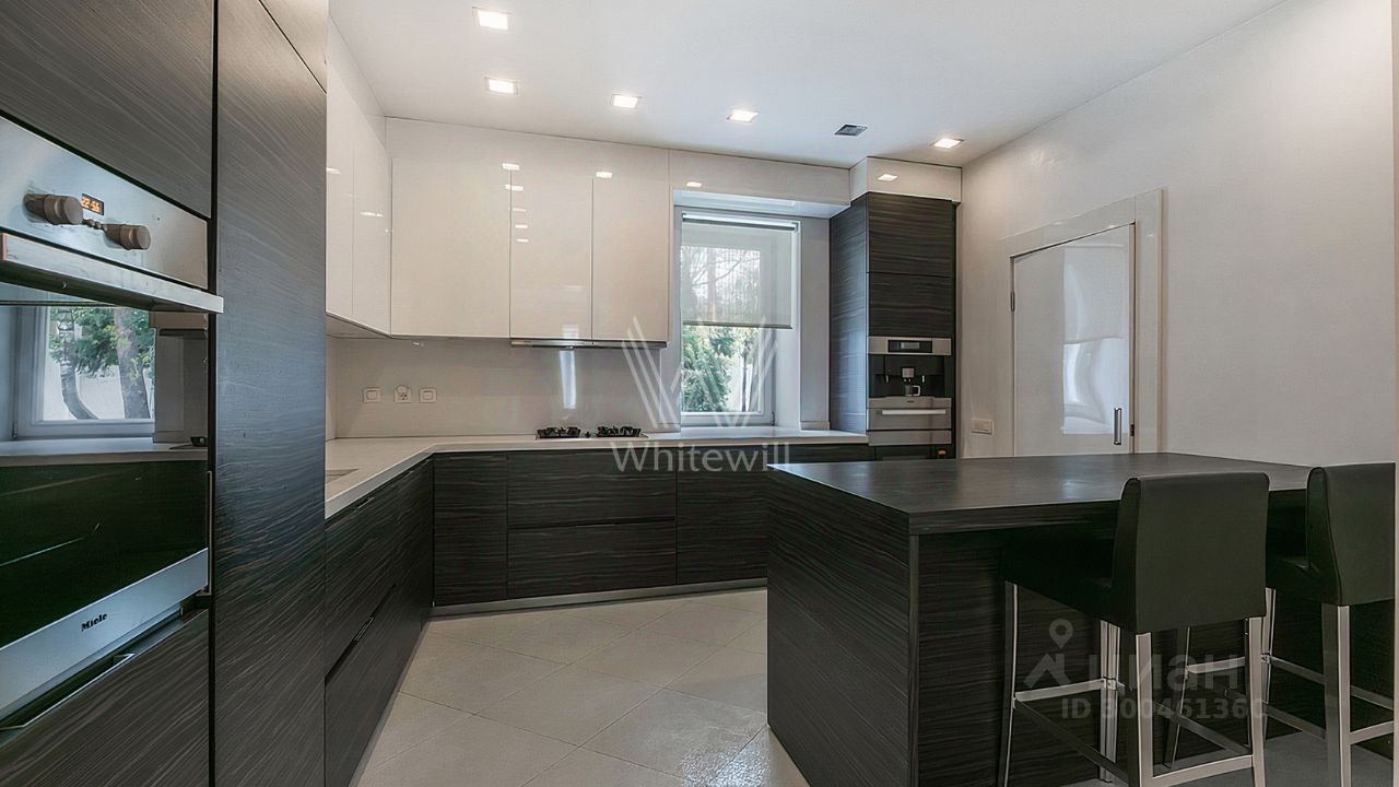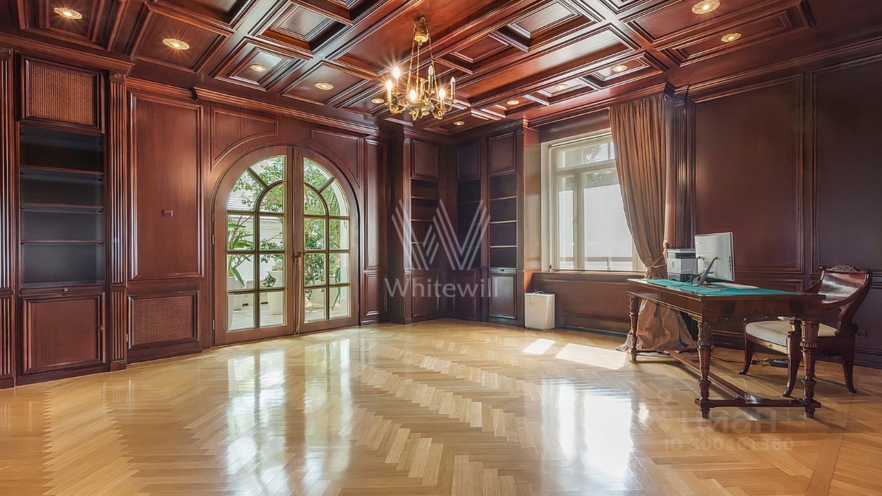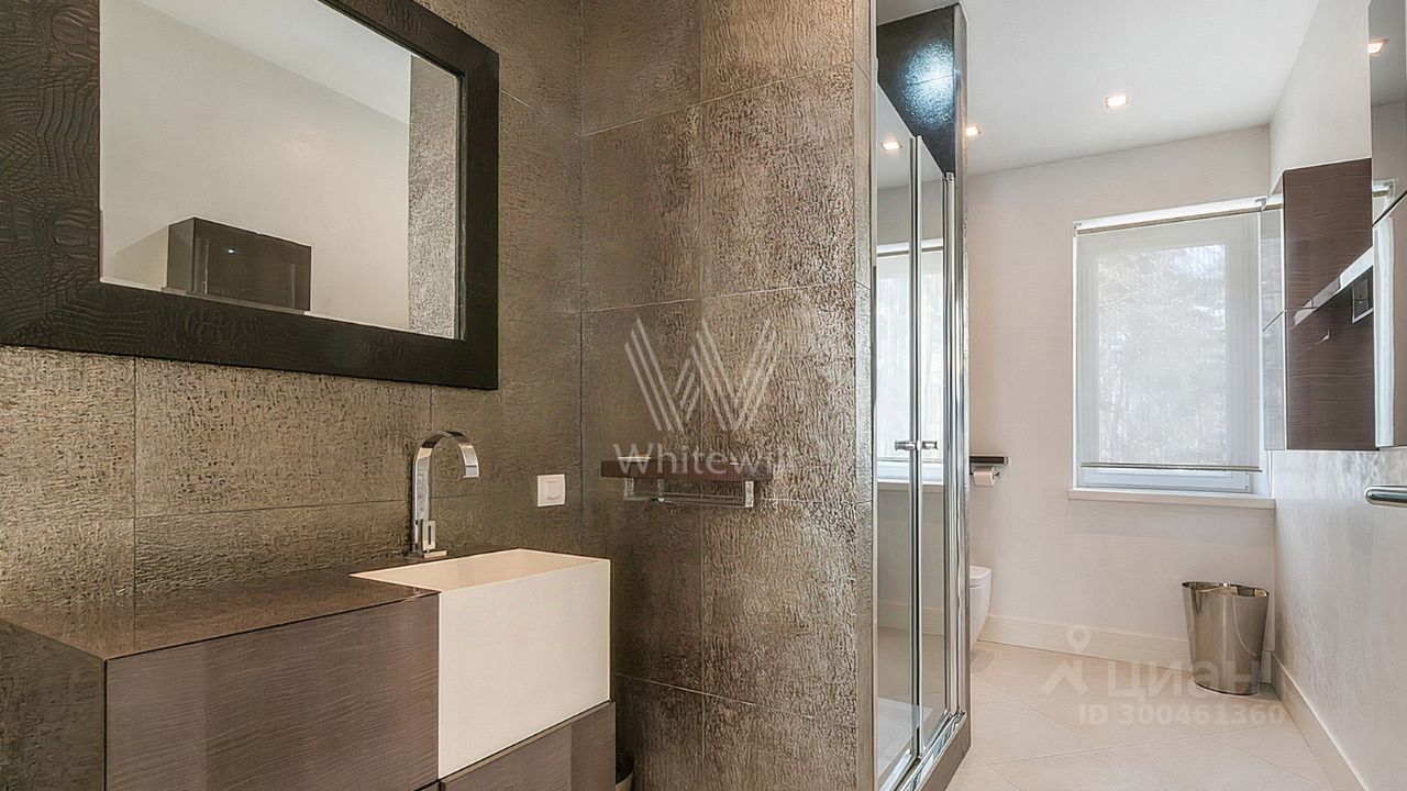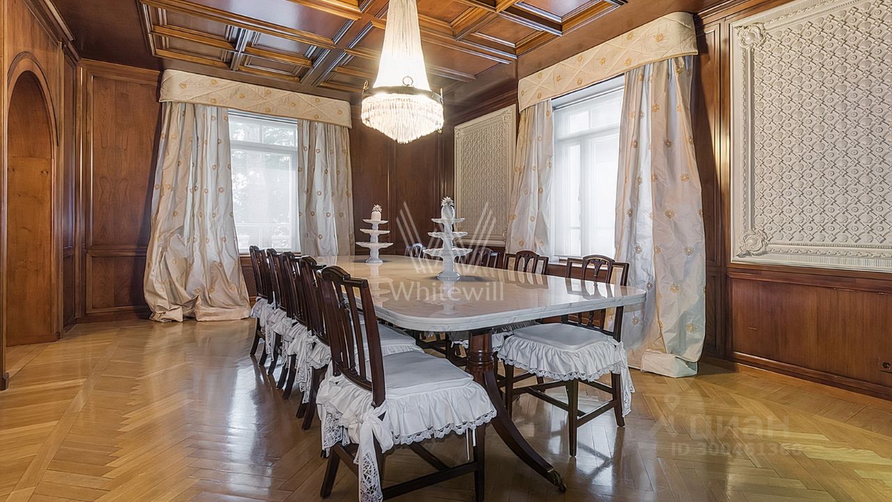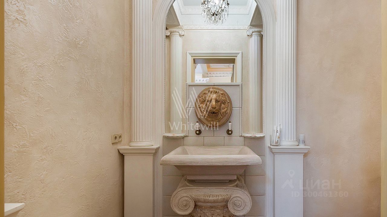ID 12 268. Новь. Загородный особняк площадью 980 м² построен на просторном участке 53 сотки с многолетними деревьями. Молочный фасад здания выдержан в классическом стиле и декорирован колоннами, балясинами и резными элементами. В отделке интерьера преобладают теплые оттенки в сочетании с фактурой дерева. Планировка резиденции включает 6 спален, гостиную, кабинет-библиотеку, спортивный зал, зимнюю и летнюю веранду, кинотеатр и хаммам. Рядом расположены гостевой дом с 2-мя спальнями и гараж на 2 машины с квартирой для персонала на втором этаже. На участке выполнен ландшафтный дизайн, вымощены дорожки и установлено уличное освещение.
