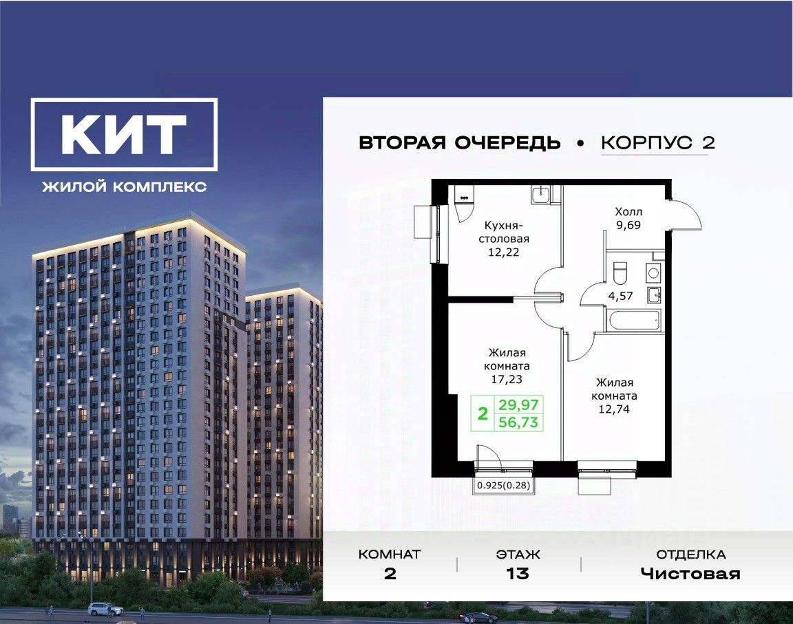 Продаётся 2-к квартира 56.73 кв.м. с чистовой отделкой в ЖК ''КИТ-2'' на 13-м этаже 25 этажного дома. Жилой комплекс ''Кит 2'' спроектирован в урбанистической концепции ''Город в Городе''. Объект бизнес-класса предлагает рациональный подход к набору опций, необходимых для гармоничной жизни. Проект представляет собой два корпуса, которые образуют единую приватную территорию. Ее доминантой является двор с красивым ландшафтным дизайном и различными зонами, ориентированными на интересы жителей разного возраста. При создании пространства в приоритет ставился комфорт жителей. В шаговой доступности находятся: торговый центр, рестораны, кинотеатры, спортивный зал, образовательные учреждения и множество других объектов в сфере услуг.