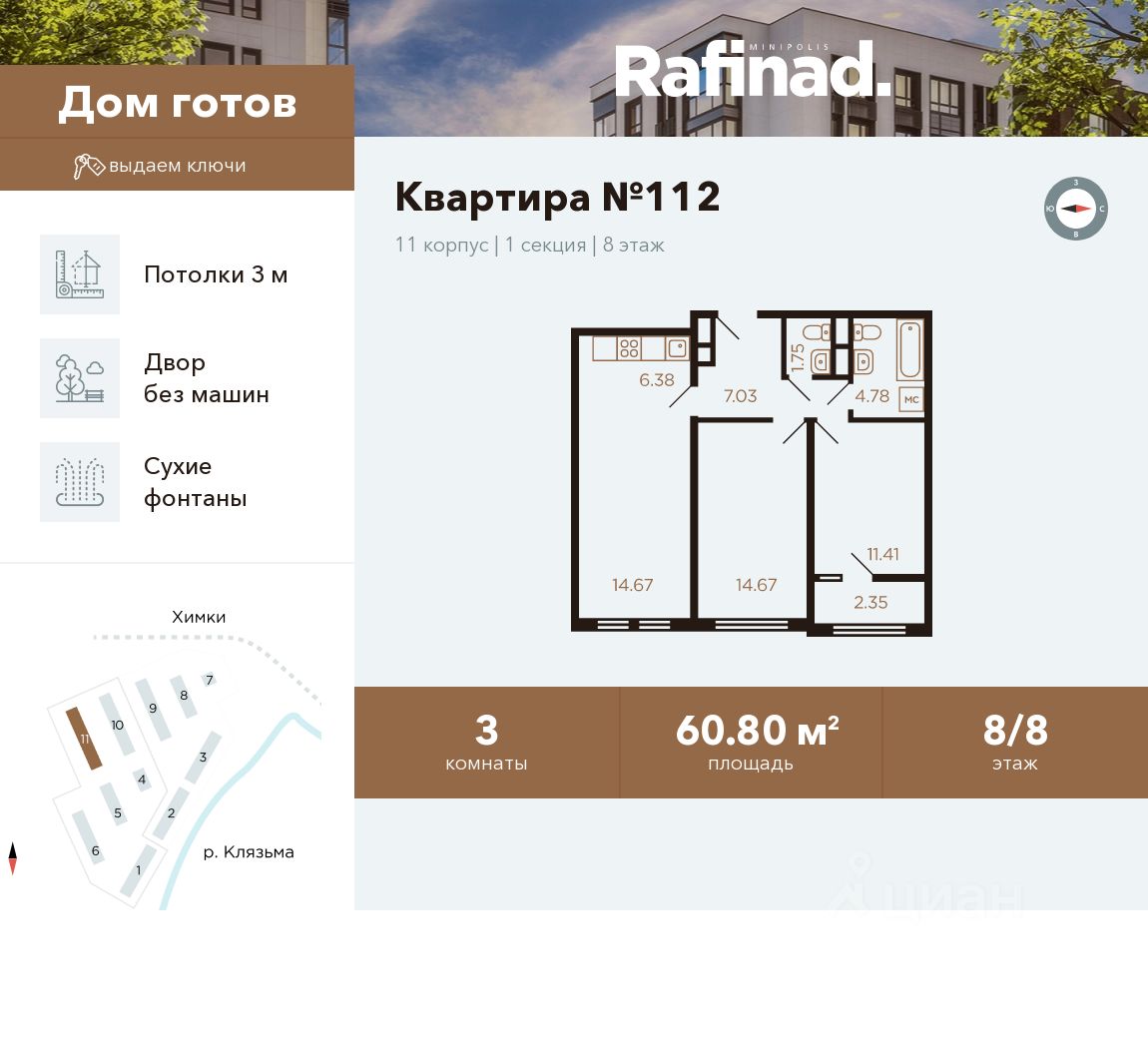 Продаётся 3-комнатная квартира общей площадью 60.80 м² на 8 этаже.