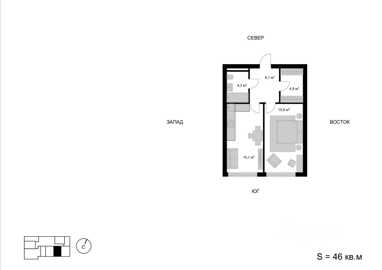 Продаётся 1-комнатная квартира в строящемся доме (Корпус 1), срок сдачи: IV-кв. 2025, общей площадью 46 кв.м., на 2 этаже. Многоквартирный жилой дом со встроенно-пристроенными нежилыми помещениями и автостоянкой