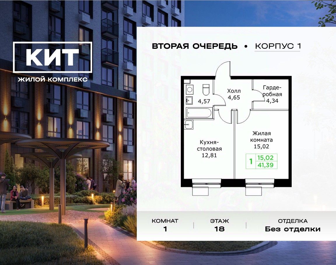 Продаётся 1-к квартира 41.39 кв.м. без отделки в ЖК ''КИТ2'' на 18-м этаже 25 этажного дома.Жилой комплекс ''Кит 2'' спроектирован в урбанистической концепции ''Город в Городе''. Объект бизнес-класса предлагает рациональный подход к набору опций, необходимых для гармоничной жизни. Проект представляет собой два корпуса, которые образуют единую приватную территорию. Ее доминантой является двор с красивым ландшафтным дизайном и различными зонами, ориентированными на интересы жителей разного возраста. При создании пространства в приоритет ставился комфорт жителей. В шаговой доступности находятся: торговый центр, рестораны, кинотеатры, спортивный зал, образовательные учреждения и множество других объектов в сфере услуг.
