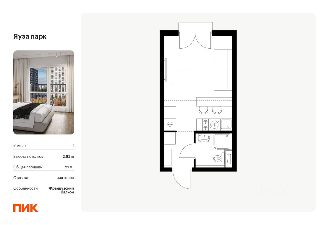 Продаётся квартира-студия площадью 21 кв.м на 6 этаже 25 этажного дома (Корпус 2, Секция 1) проекта ПИК Яуза парк. Светлый просторный подъезд на уровне земли, функциональная планировка, большие окна, .