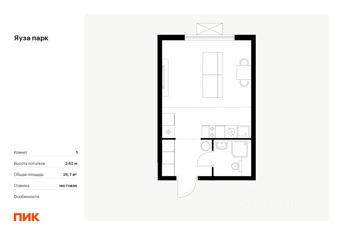 Продаётся квартира-студия площадью 26,7 кв.м на 24 этаже 24 этажного дома (Корпус 5, Секция 1) проекта ПИК Яуза парк. Светлый просторный подъезд на уровне земли, функциональная планировка, большие окна, .