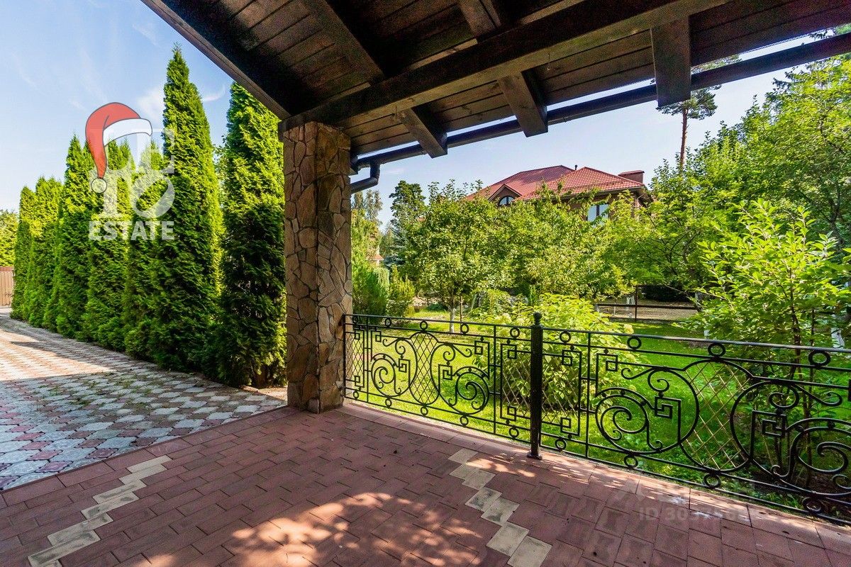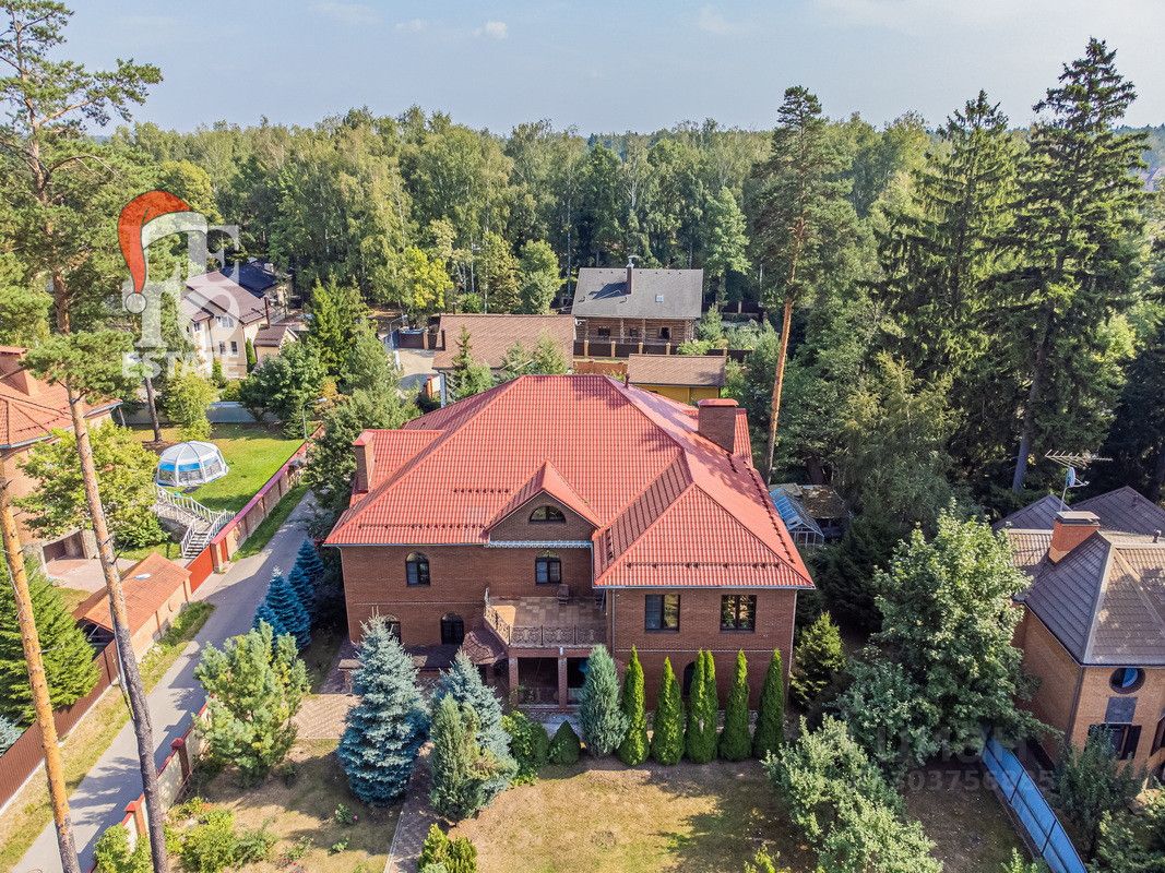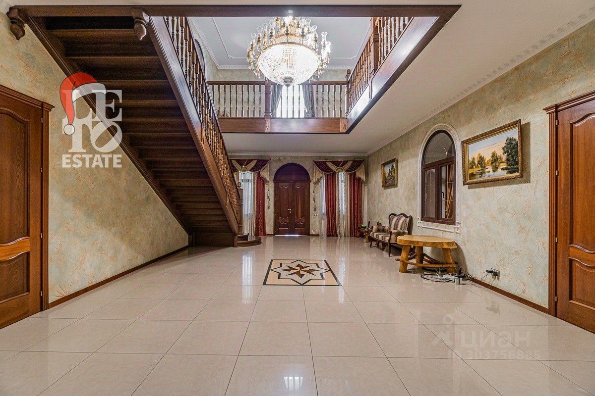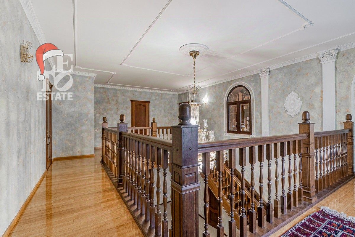 Дом 2013 года постройки, состоит из двух этажей, а также цокольного, полностью меблирован и готов к проживанию, ремонт выполнен из дорогих, высококачественных материалов. Центром притяжения в доме, является большой холл с массивной лестницей из кавказского дуба и вторым светом. Также дом располагает пятью спальнями, зимним садом с зоной барбекю и террасой, зоной СПА с бассейном и сауной, в мансарде расположен спортзал. Дом стоит на монолитно-ленточном фундаменте глубиной 2,4 м. В стоимость входит отдельно стоящее здание с гаражом на первом этаже и квартирой для персонала на втором этаже. Несколько уровней подготовки и очистки воды. Все коммуникации центральные, отопление газовым котлом, мощностью 60 кВт. На участке выполнен ландшафтный дизайн, дорожки вымощены тротуарной плиткой, высажены плодовые, а также хвойные деревья, дубы, кустарники, цветы, виноград. Украшает сад пруд с фонтаном и рыбками. Поселок под круглосуточной охраной. До Пироговского водохранилища 4 км.