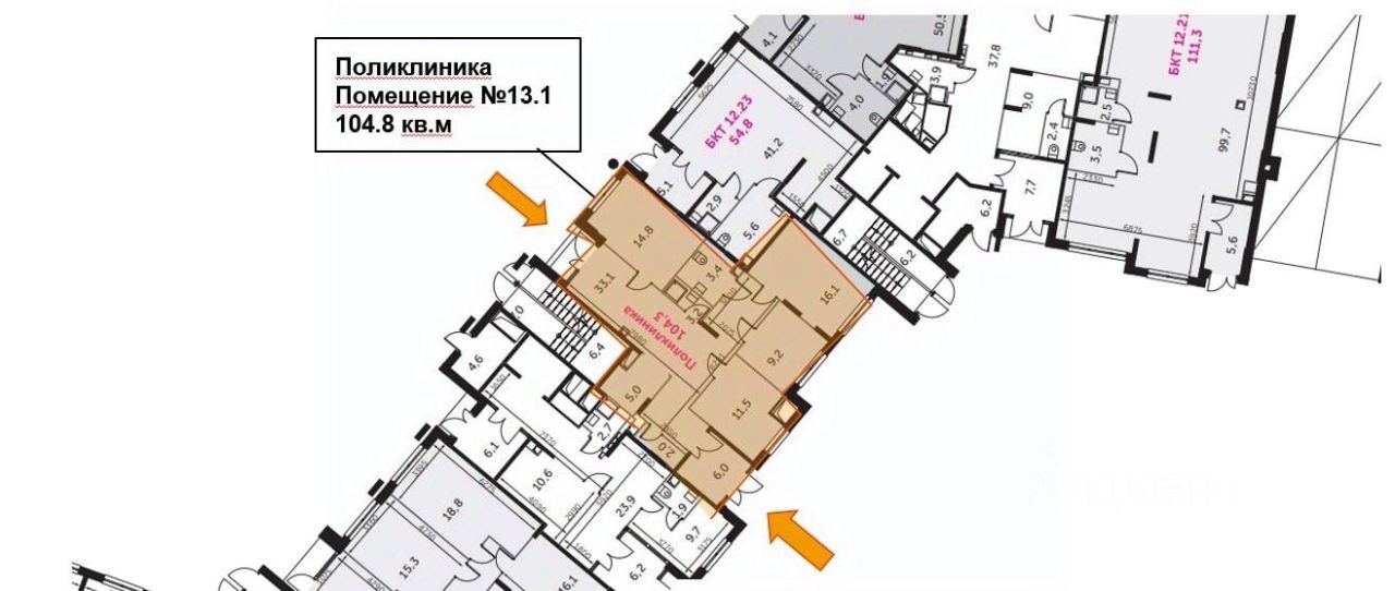 Площадь от 104,8 кв. м до 308,6 м2, корпус 2, первый этаж, 1 вход с улицы, 1 вход со двора. Центральное местоположение, рядом с ТЦ, к помещению есть свободный подъезд и напротив входа есть стихийная парковка. Высота потолков 5,4 м, выделенная мощность - 0,2кВт/ м2, состояние помещения - shell&core. заведены точки подключения к системам вентиляции, гвс/хвс, канализации. В помещении большие витринных окна, предназначено под организацию поликлиники/мед. кабинета, под помещением - тех. этаж+кладовые. Дом введен в эксплуатацию в 4 кв. 2023 г.