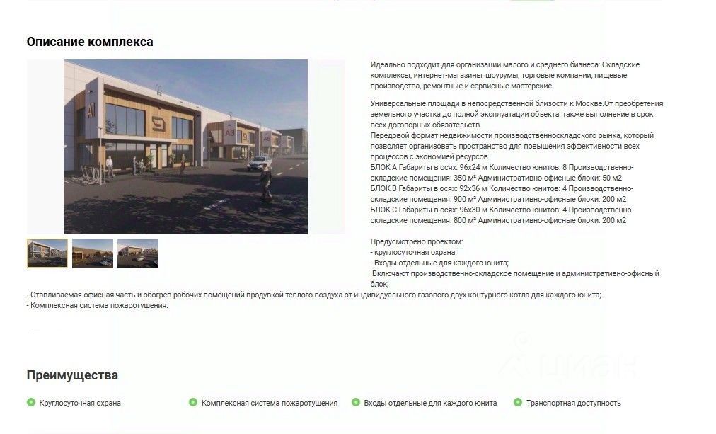 Идеально подходит для организации малого и среднего бизнеса: Складские комплексы, интернет-магазины, шоурумы, торговые компании, пищевые производства, ремонтные и сервисные мастерские Универсальные площади в непосредственной близости к Москве.От преобретения земельного участка до полной эксплуатации объекта, также выполнение в срок всех договорных обязательств. Передовой формат недвижимости производственноскладского рынка, который позволяет организовать пространство для повышения эффективности всех процессов с экономией ресурсов. БЛОК А Габариты в осях: 96x24 м Количество юнитов: 8 Производственно-складские помещения: 350 м Административно-офисные блоки: 50 м2 БЛОК В Габариты в осях: 92x36 м Количество юнитов: 4 Производственно-складские помещения: 900 м Административно-офисные блоки: 200 м2 БЛОК C Габариты в осях: 96x30 м Количество юнитов: 4 Производственно-складские помещения: 800 м Административно-офисные блоки: 200 м2 Предусмотрено проектом: - круглосуточная охрана, - Входы отдельные для каждого юнита, Включают производственно-складское помещение и административно-офисный блок, - Отапливаемая офисная часть и обогрев рабочих помещений продувкой теплого воздуха от индивидуального газового двух контурного котла для каждого юнита, - Комплексная система пожаротушения. Номер в базе: J6514