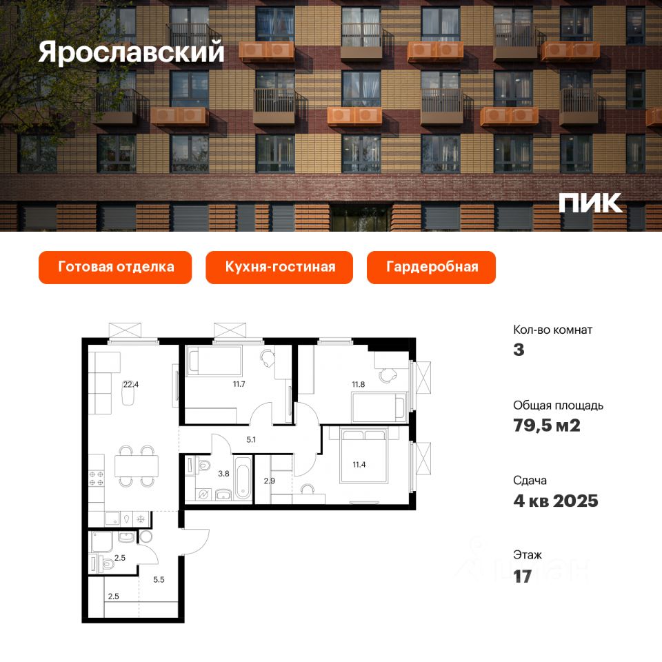 Продаётся 3-комн. квартира площадью 79,5 кв.м на 17 этаже 25 этажного дома (Корпус 16.4, Секция 4) проекта ПИК Ярославский. Светлый просторный подъезд на уровне земли, функциональная планировка, большие окна, c отделкой.