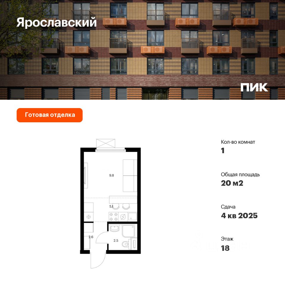 Продаётся квартира-студия площадью 20 кв.м на 18 этаже 25 этажного дома (Корпус 16.4, Секция 4) проекта ПИК Ярославский. Светлый просторный подъезд на уровне земли, функциональная планировка, большие окна, c отделкой.