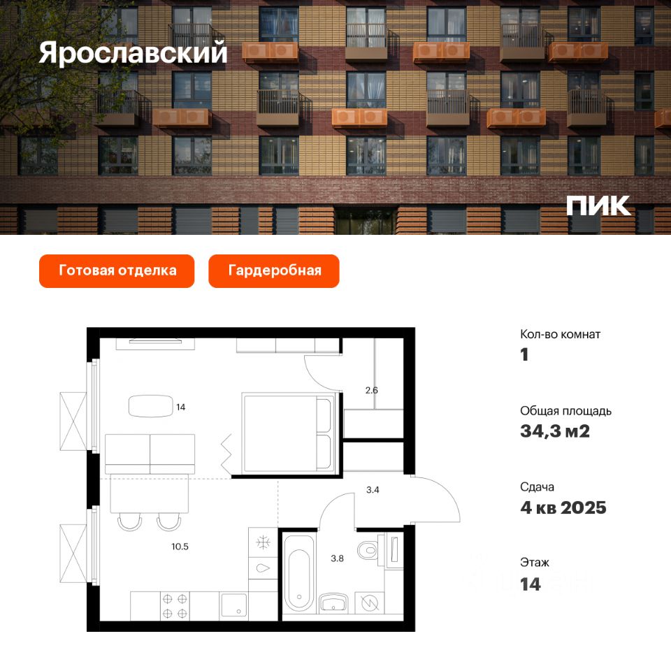 Продаётся 1-комн. квартира площадью 34,3 кв.м на 14 этаже 25 этажного дома (Корпус 16.3, Секция 3) проекта ПИК Ярославский. Светлый просторный подъезд на уровне земли, функциональная планировка, большие окна, c отделкой.