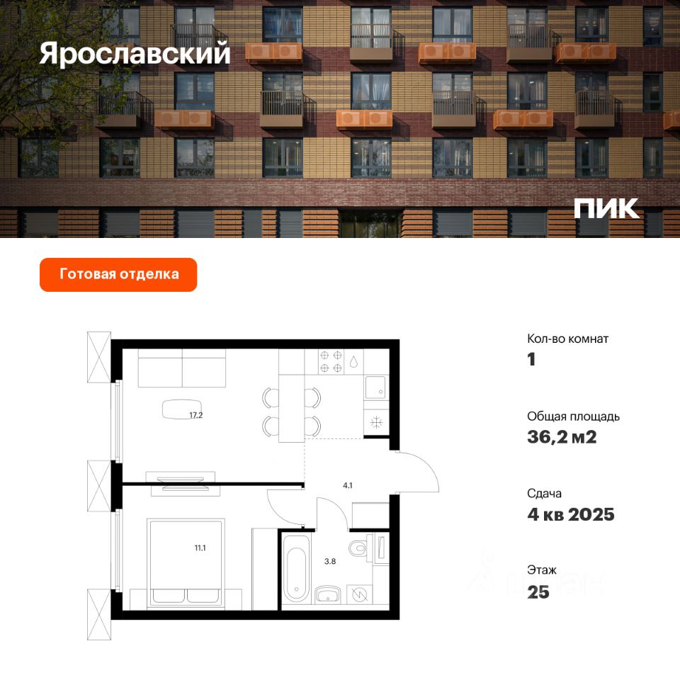 Продаётся 1-комн. квартира площадью 36,2 кв.м на 25 этаже 25 этажного дома (Корпус 16.1, Секция 1) проекта ПИК Ярославский. Светлый просторный подъезд на уровне земли, функциональная планировка, большие окна, c отделкой.
