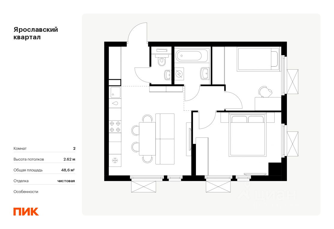 Продаётся 2-комн. квартира площадью 48,6 кв.м на 14 этаже 25 этажного дома (Корпус 1.4, Секция 1) проекта ПИК Ярославский квартал. Светлый просторный подъезд на уровне земли, функциональная планировка, большие окна, .