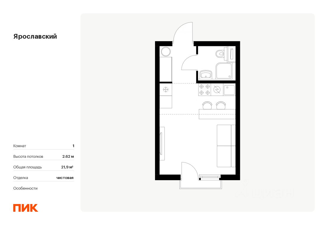 Продаётся квартира-студия площадью 21,9 кв.м на 3 этаже 25 этажного дома (Корпус 16.2, Секция 2) проекта ПИК Ярославский. Светлый просторный подъезд на уровне земли, функциональная планировка, большие окна, .