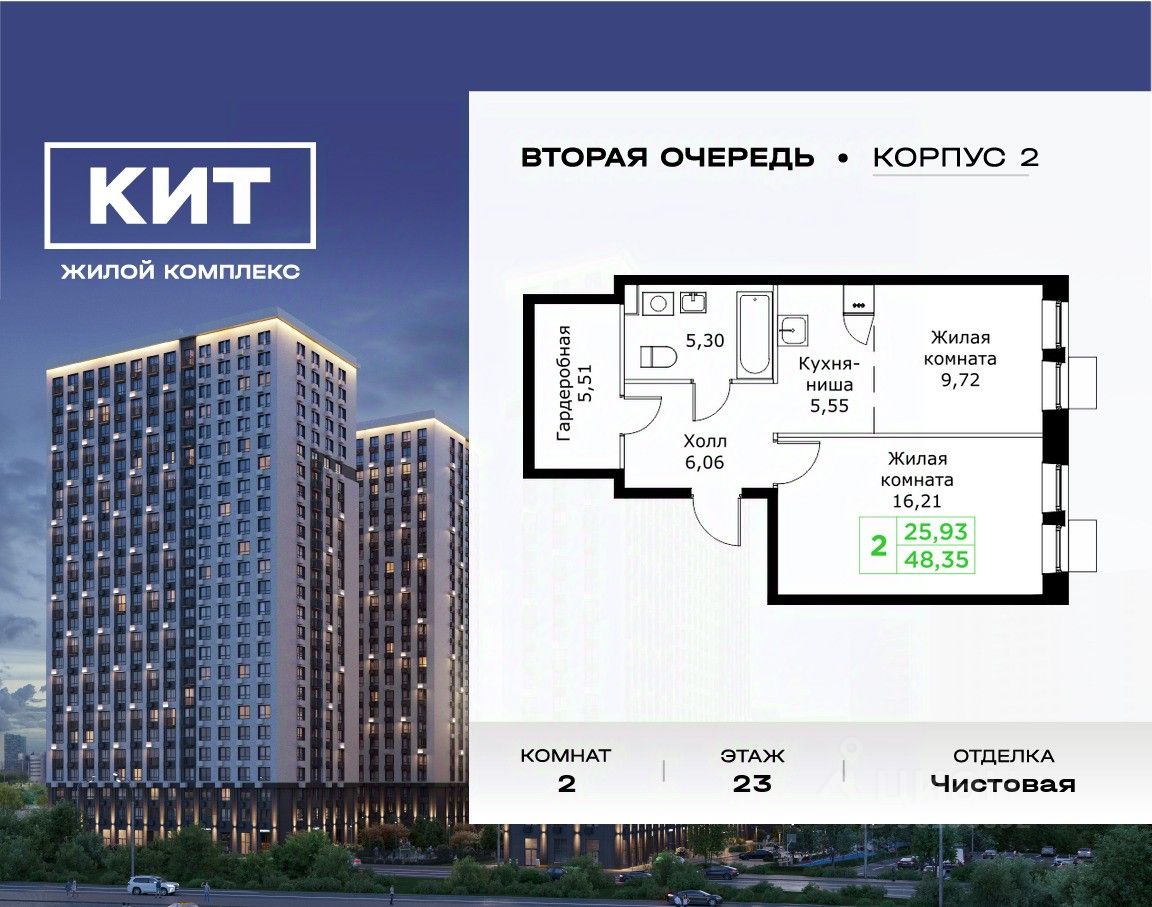 Продаётся 2-к квартира 48.35 кв.м. с чистовой отделкой в ЖК ''КИТ2'' на 23-м этаже 25 этажного дома.Жилой комплекс ''Кит 2'' спроектирован в урбанистической концепции ''Город в Городе''. Объект бизнес-класса предлагает рациональный подход к набору опций, необходимых для гармоничной жизни. Проект представляет собой два корпуса, которые образуют единую приватную территорию. Ее доминантой является двор с красивым ландшафтным дизайном и различными зонами, ориентированными на интересы жителей разного возраста. При создании пространства в приоритет ставился комфорт жителей. В шаговой доступности находятся: торговый центр, рестораны, кинотеатры, спортивный зал, образовательные учреждения и множество других объектов в сфере услуг.