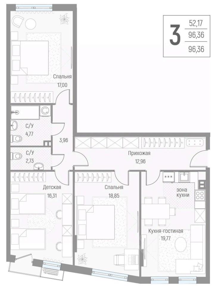 Прямая продажа от застройщика! Продаётся 3-комнатная квартира общей площадью 96,4 кв.м на 2-м этаже 4 этажного дома. Дом сдан.