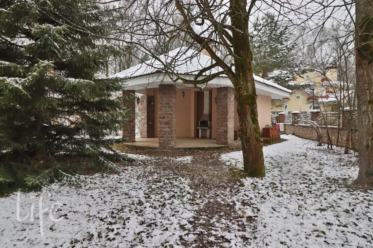 Данный земельный участок, имеющий трапециевидную конфигурацию, отличается тщательно спланированным ландшафтным дизайном. На территории присутствуют газонные покрытия, декоративные и плодовые древесные насаждения, а также разнообразные кустарниковые культуры. Участок оснащен системой дренажа, системой уличного освещения и автоматизированной системой полива. Для обеспечения удобства пользователей на территории предусмотрены беседка с мангалом и служебное помещение.