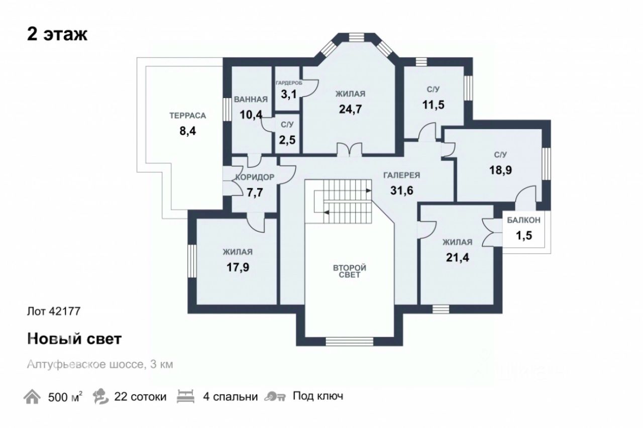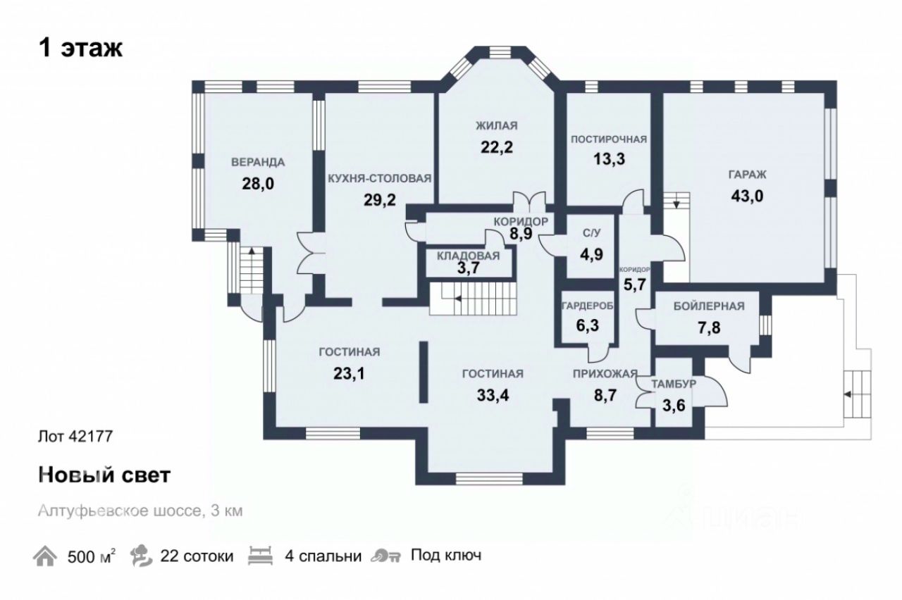 Лот 42177. Дом под ключ 500 кв.м. на участке 22.00 соток. Количество спален: 4.