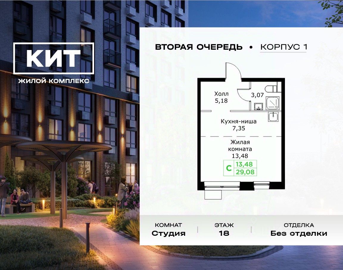 Продаётся студия 29.08 кв.м. без отделки в ЖК ''КИТ2'' на 18-м этаже 25 этажного дома.Жилой комплекс ''Кит 2'' спроектирован в урбанистической концепции ''Город в Городе''. Объект бизнес-класса предлагает рациональный подход к набору опций, необходимых для гармоничной жизни. Проект представляет собой два корпуса, которые образуют единую приватную территорию. Ее доминантой является двор с красивым ландшафтным дизайном и различными зонами, ориентированными на интересы жителей разного возраста. При создании пространства в приоритет ставился комфорт жителей. В шаговой доступности находятся: торговый центр, рестораны, кинотеатры, спортивный зал, образовательные учреждения и множество других объектов в сфере услуг.