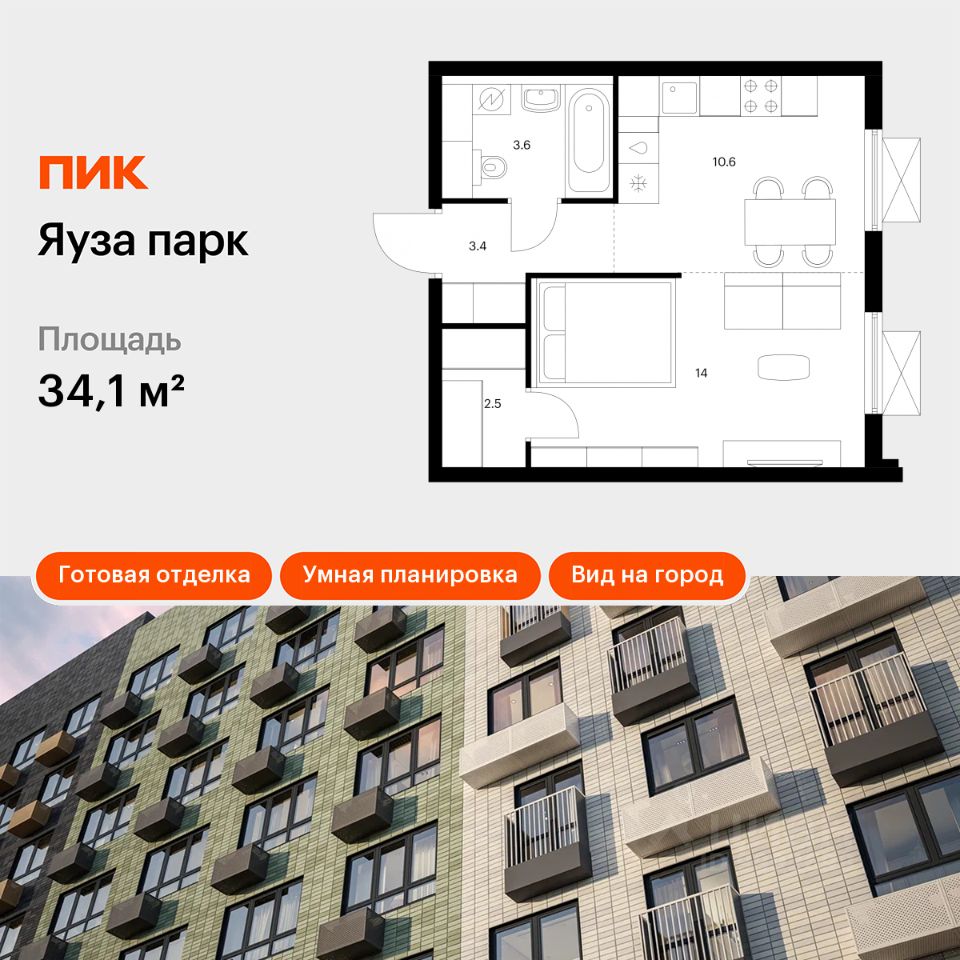 Продаётся 1-комн. квартира площадью 34,1 кв.м на 7 этаже 24 этажного дома (Корпус 6, Секция 1) проекта ПИК Яуза парк. Светлый просторный подъезд на уровне земли, функциональная планировка, большие окна, c отделкой.