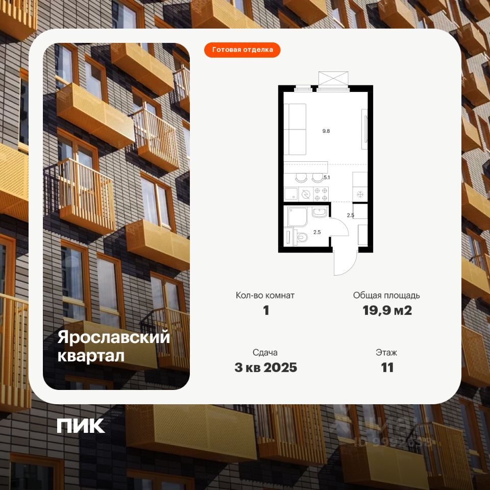 Продаётся квартира-студия площадью 19,9 кв.м на 11 этаже 25 этажного дома (Корпус 1.4, Секция 1) проекта ПИК Ярославский квартал. Светлый просторный подъезд на уровне земли, функциональная планировка, большие окна, c отделкой.
