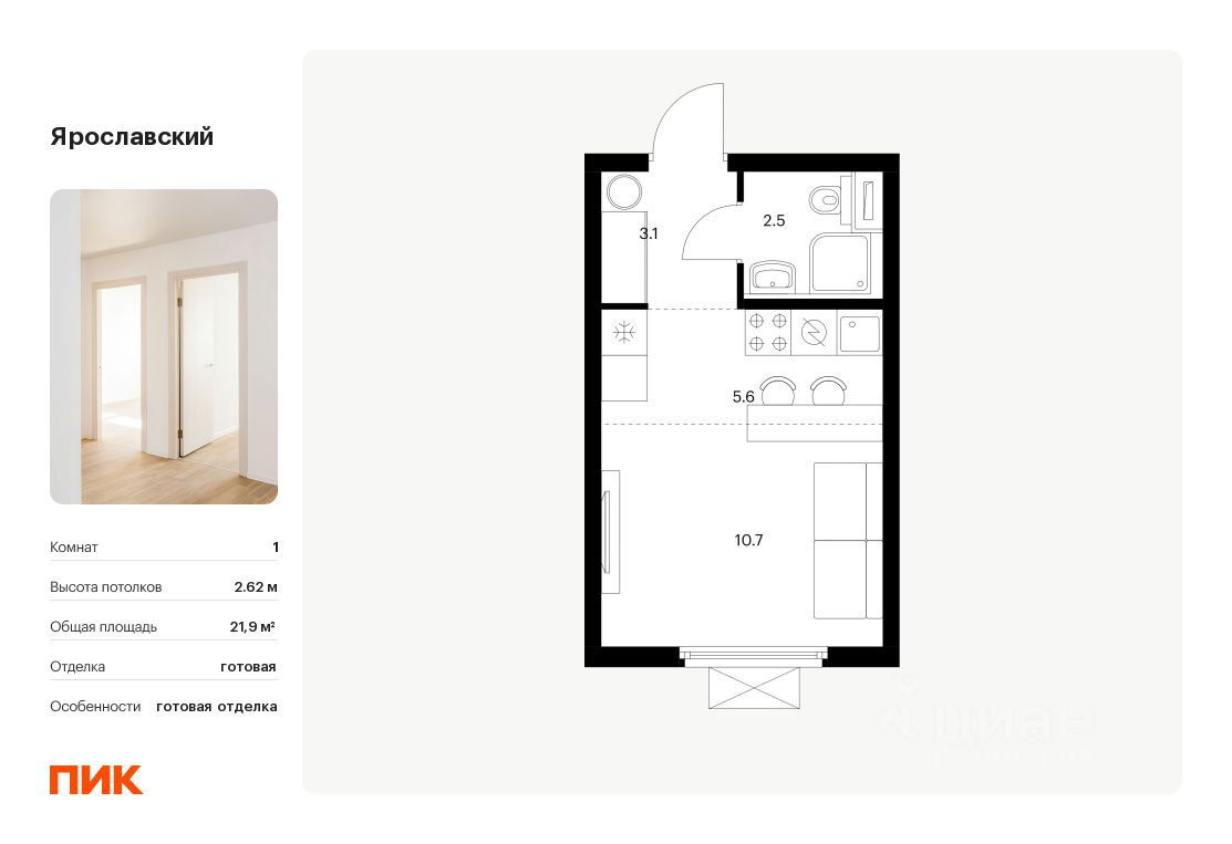 Продаётся квартира-студия площадью 21,9 кв.м на 7 этаже 25 этажного дома (Корпус 16.2, Секция 2) проекта ПИК Ярославский. Светлый просторный подъезд на уровне земли, функциональная планировка, большие окна, c отделкой.