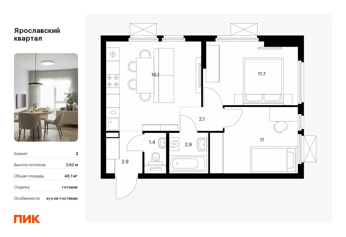 Продаётся 2-комн. квартира площадью 48,1 кв.м на 19 этаже 25 этажного дома (Корпус 1.2, Секция 1) проекта ПИК Ярославский квартал. Светлый просторный подъезд на уровне земли, функциональная планировка, большие окна, c отделкой.