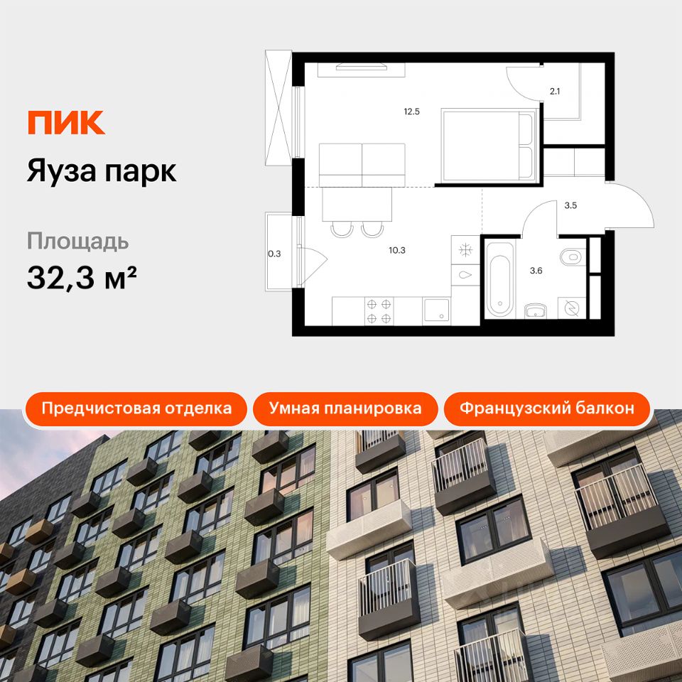 Продаётся 1-комн. квартира площадью 32,3 кв.м на 2 этаже 24 этажного дома (Корпус 10, Секция 1) проекта ПИК Яуза парк. Светлый просторный подъезд на уровне земли, функциональная планировка, большие окна, предчистовая отделка.