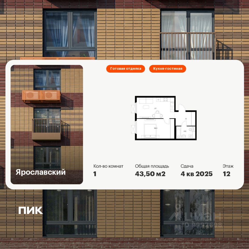 Продаётся 1-комн. квартира площадью 43,5 кв.м на 12 этаже 25 этажного дома (Корпус 16.3, Секция 3) проекта ПИК Ярославский. Светлый просторный подъезд на уровне земли, функциональная планировка, большие окна, c отделкой.