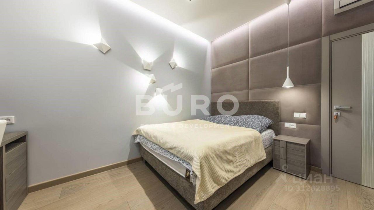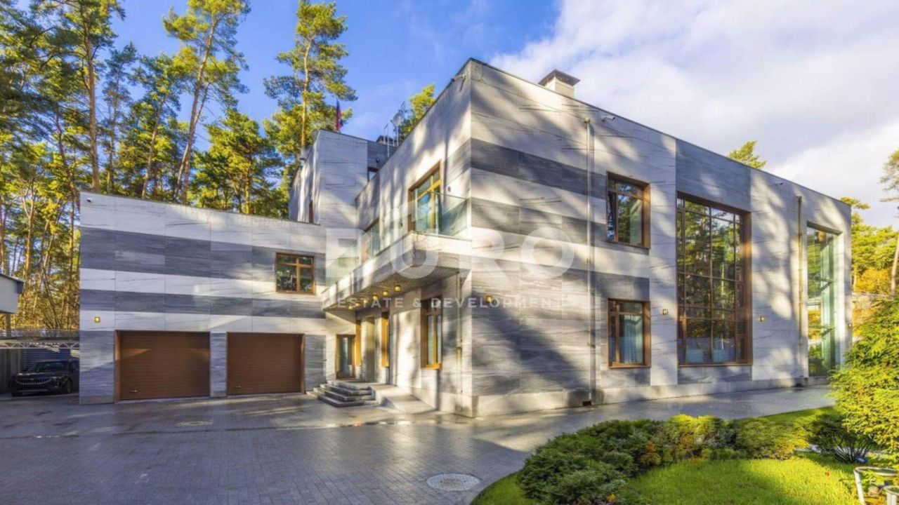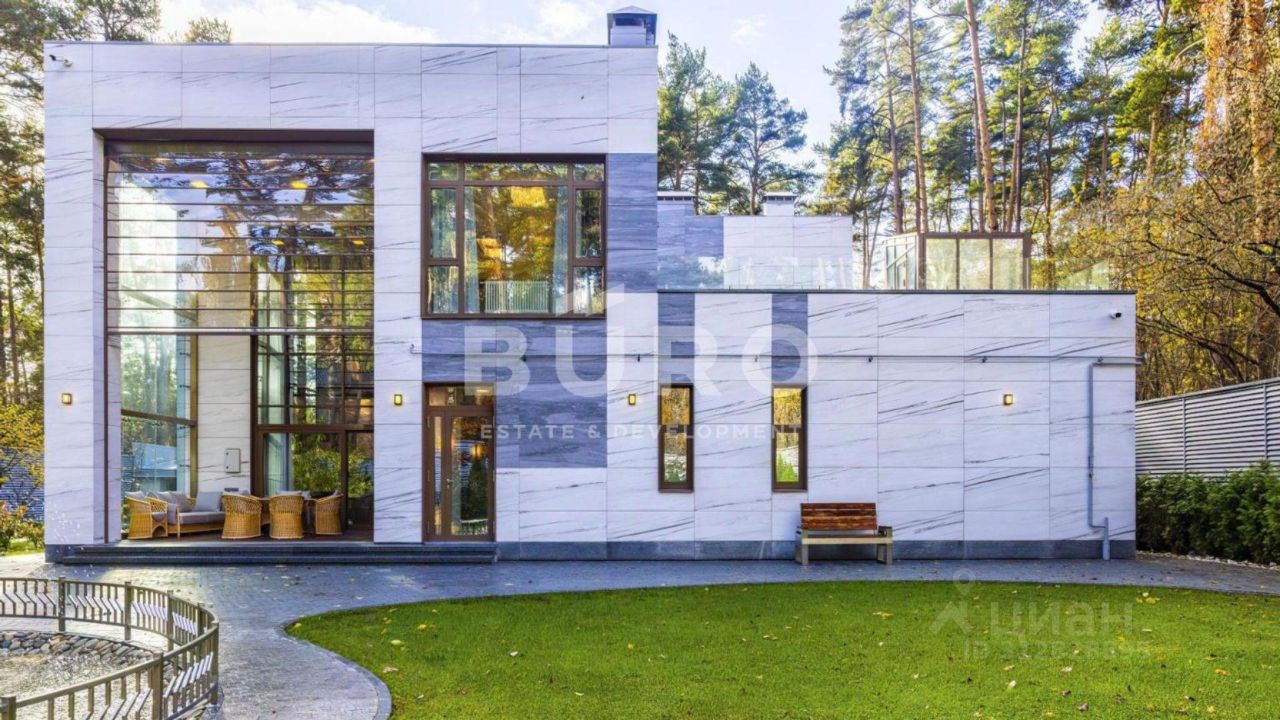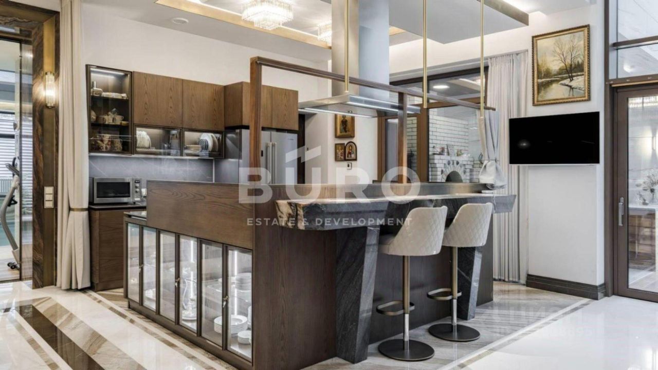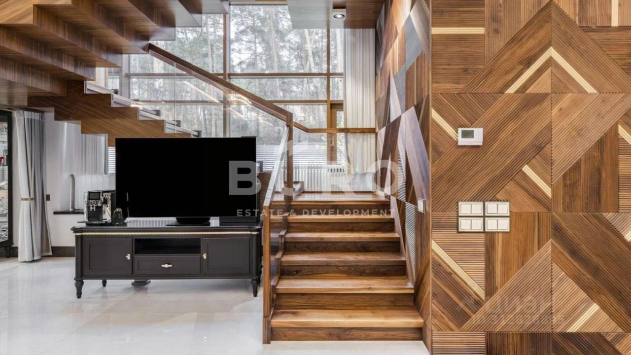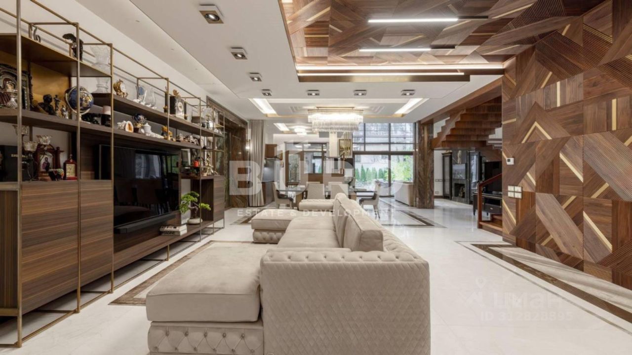 Современный фасад в светло-бежевых и серых тонах подчеркивается элементами декоративной подсветки. Внутри выполнена премиальная отделка с использованием натуральных материалов — стены и многоуровневые потолки украшены панелями из ценных пород дерева. Дом оснащен системами для подогрева полов, приточно-вытяжной вентиляцией и кондиционированием.