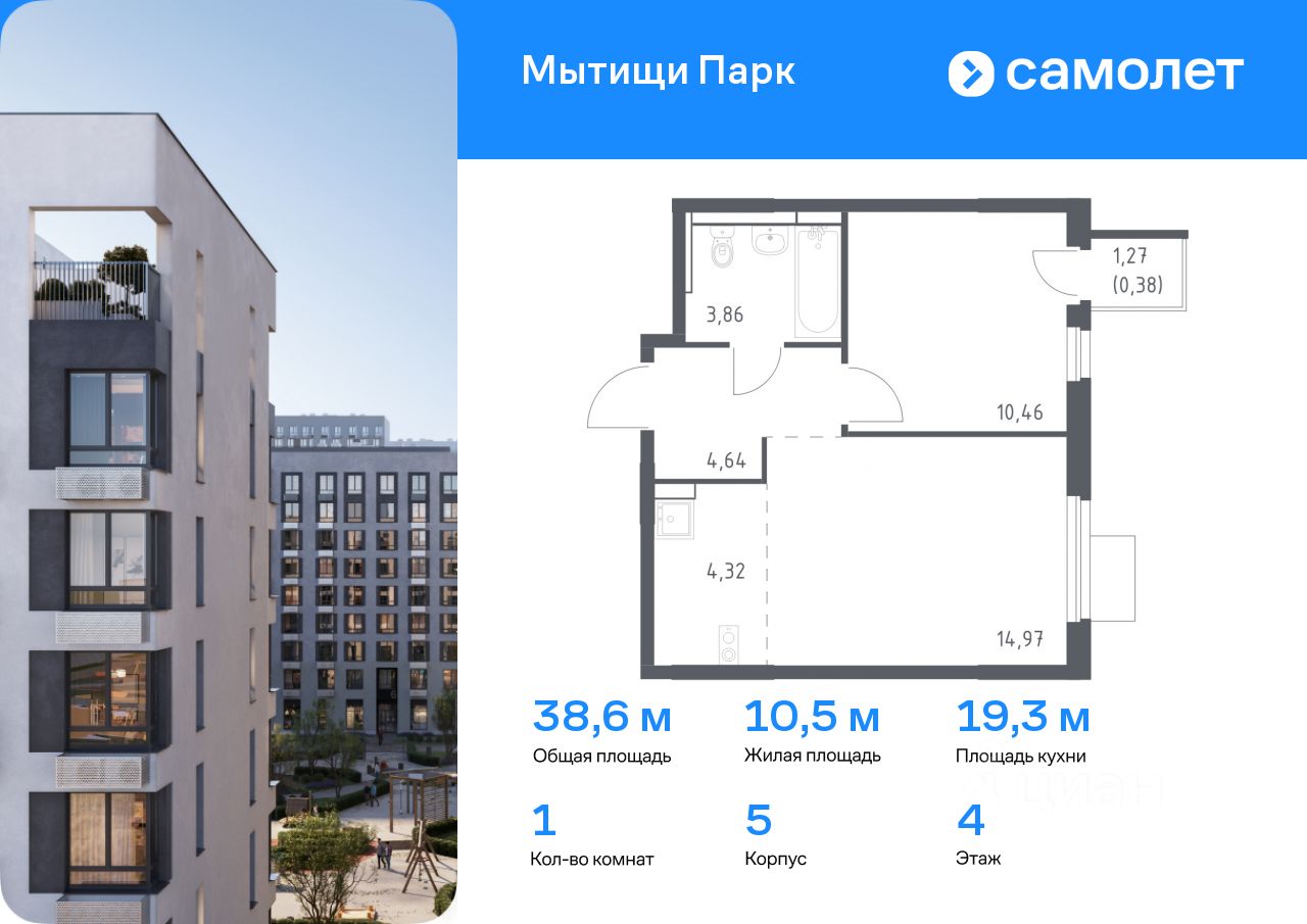 Предлагается 1-комнатная квартира комфорт-класса 38,63 кв.м в корпусе 5 на 4 этаже, в ЖК ''Мытищи Парк''